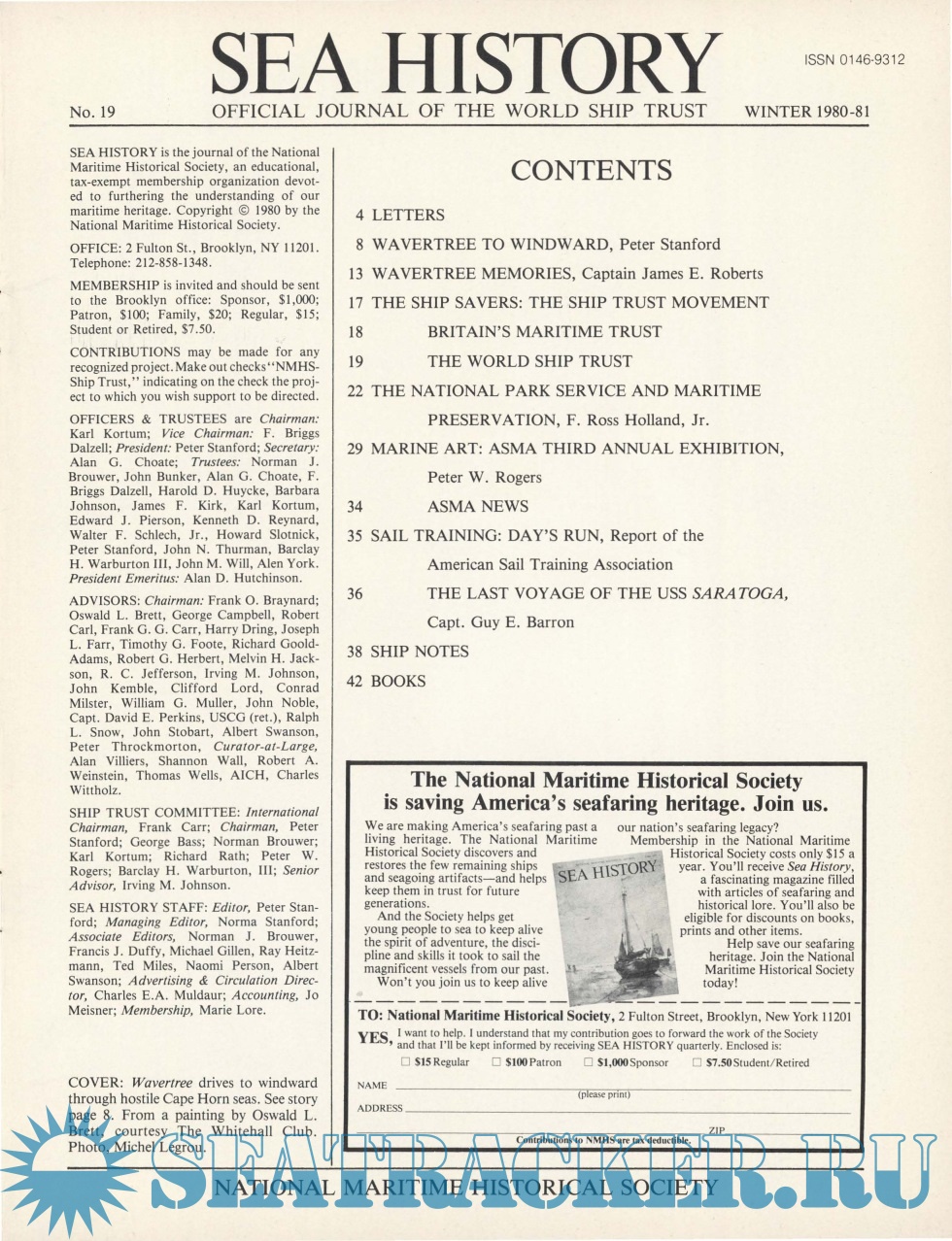 Description: Sea History is a quarterly magazine published by the National Maritime Historical Society (NMHS) focusing on naval and maritime history. The magazine was first published in April 1972. It is edited by Deirdre O'Regan.