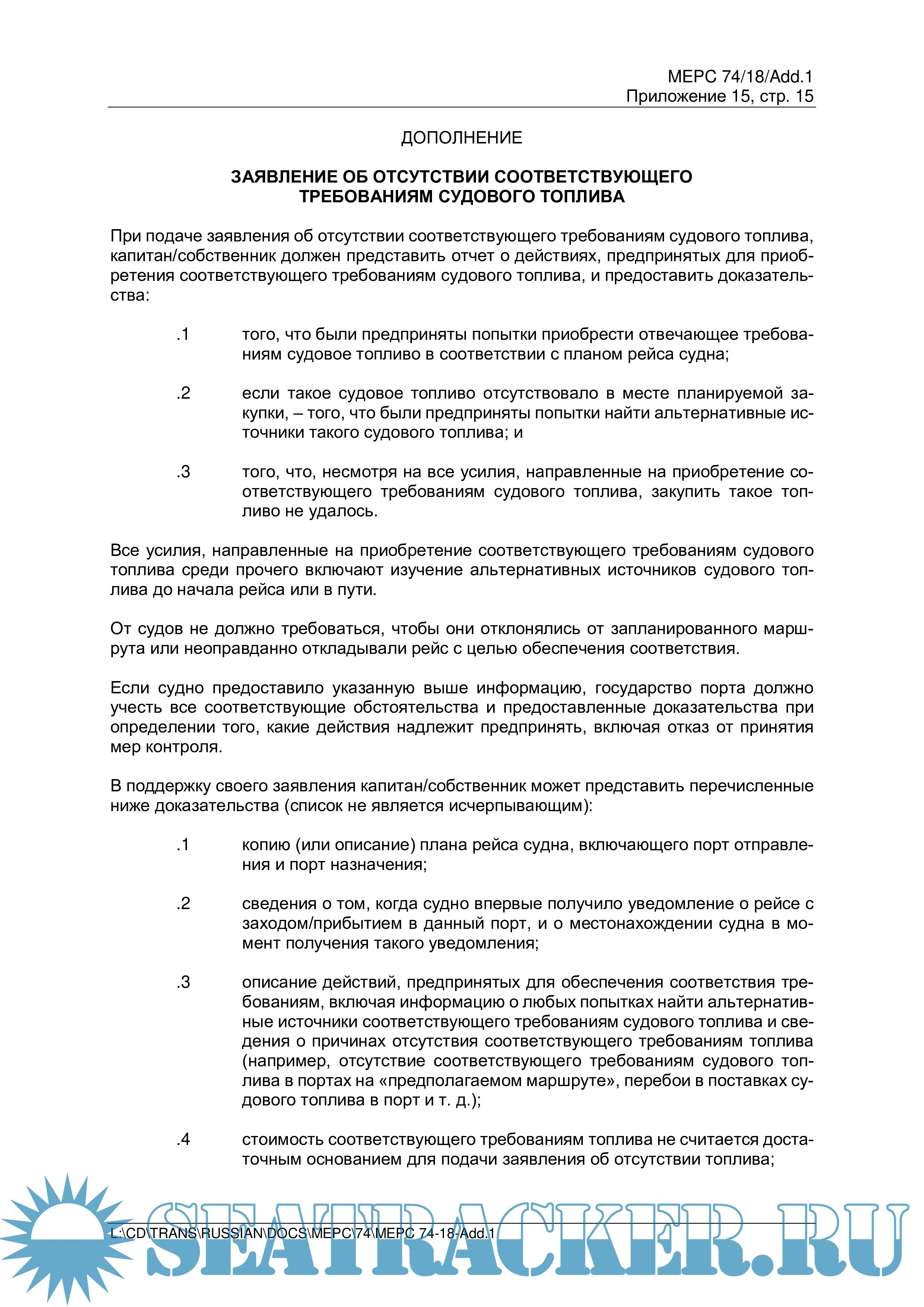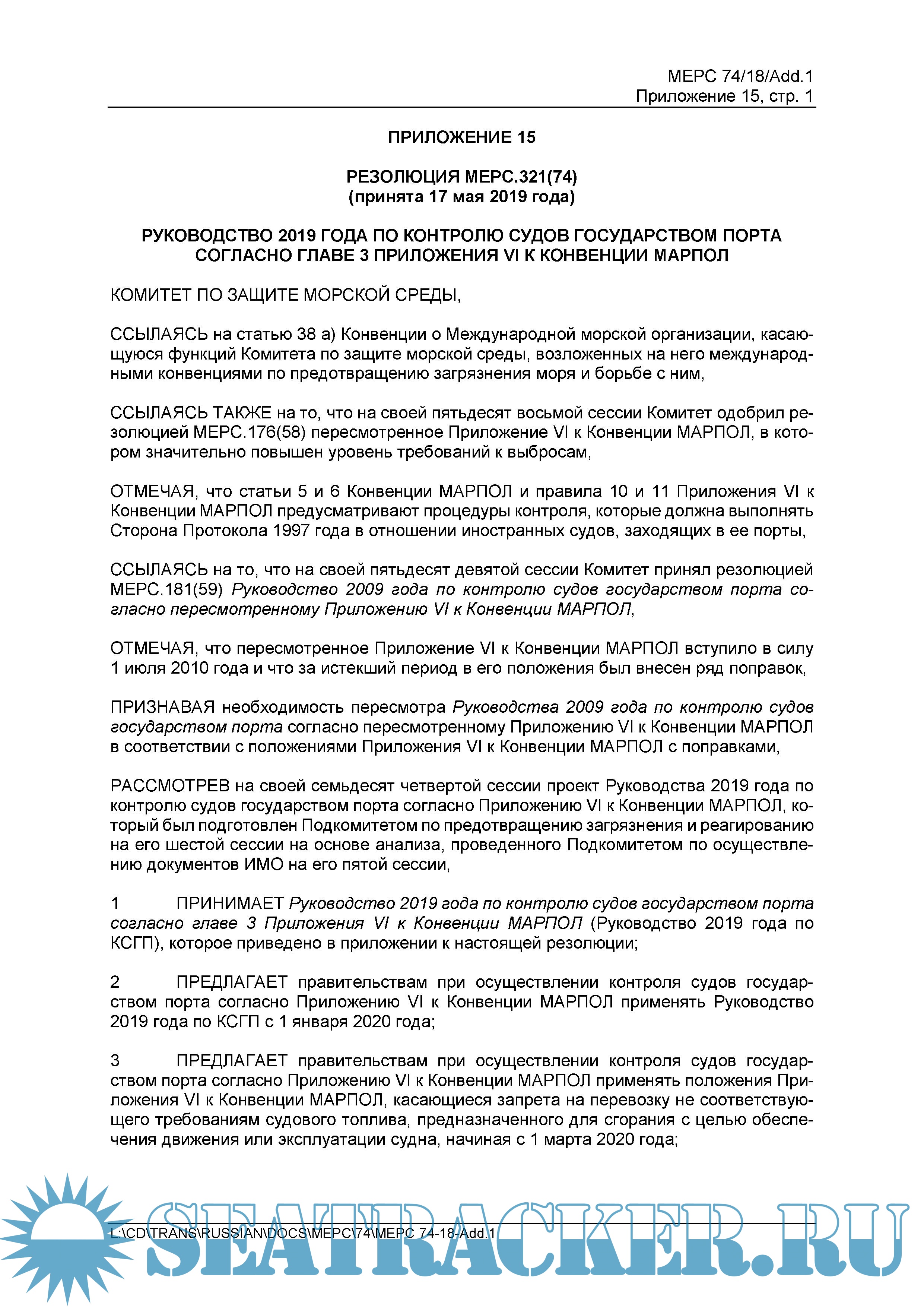 ). РЕЗОЛЮЦИЯ MEPC.321 (74) (принята 17 мая 2019 года) РУКОВОДСТВО 2019 ГОДА ПО КОНТРОЛЮ СУДОВ ГОСУДАРСТВОМ ПОРТА СОГЛАСНО ГЛАВЕ 3 ПРИЛОЖЕНИЯ VI К КОНВЕНЦИИ МАРПОЛ КОМИТЕТ ПО ЗАЩИТЕ МОРСКОЙ СРЕДЫ, ССЫЛАЯСЬ на статью 38 а) Конвенции о Международной морской организации, касающуюся функций Комитета по защите морской среды, возложенных на него международными конвенциями по предотвращению загрязнения моря и борьбе с ним, ССЫЛАЯСЬ ТАКЖЕ на то, что на своей пятьдесят восьмой сессии Комитет одобрил резолюцией МЕРС.176(58) пересмотренное Приложение VI к Конвенции МАРПОЛ, в котором значительно повышен уровень требований к выбросам, ОТМЕЧАЯ, что статьи 5 и 6 Конвенции МАРПОЛ и правила 10 и 11 Приложения VI к Конвенции МАРПОЛ предусматривают процедуры контроля, которые должна выполнять Сторона Протокола 1997 года в отношении иностранных судов, заходящих в ее порты, ССЫЛАЯСЬ на то, что на своей пятьдесят девятой сессии Комитет принял резолюцией MEPC.181(59) Руководство 2009 года по контролю судов государством порта согласно пересмотренному Приложению VI к Конвенции МАРПОЛ, ОТМЕЧАЯ, что пересмотренное Приложение VI к Конвенции МАРПОЛ вступило в силу 1 июля 2010 года и что за истекший период в его положения был внесен ряд поправок, ПРИЗНАВАЯ необходимость пересмотра Руководства 2009 года по контролю судов государством порта согласно пересмотренному Приложению VI к Конвенции МАРПОЛ в соответствии с положениями Приложения VI к Конвенции МАРПОЛ с поправками, РАССМОТРЕВ на своей семьдесят четвертой сессии проект Руководства 2019 года по контролю судов государством порта согласно Приложению VI к Конвенции МАРПОЛ, который был подготовлен Подкомитетом по предотвращению загрязнения и реагированию на его шестой сессии на основе анализа, проведенного Подкомитетом по осуществлению документов ИМО на его пятой сессии, 1 ПРИНИМАЕТ Руководство 2019 года по контролю судов государством порта согласно главе 3 Приложения VI к Конвенции МАРПОЛ (Руководство 2019 года по КСГП), которое приведено в приложении к настоящей резолюции; 2 ПРЕДЛАГАЕТ правительствам при осуществлении контроля судов государством порта согласно Приложению VI к Конвенции МАРПОЛ применять Руководство 2019 года по КСГПс 1 января 2020 года; 3 ПРЕДЛАГАЕТ правительствам при осуществлении контроля судов государством порта согласно Приложению VI к Конвенции МАРПОЛ применять положения Приложения VI к Конвенции МАРПОЛ, касающиеся запрета на перевозку не соответствующего требованиям судового топлива, предназначенного для сгорания с целью обеспечения движения или эксплуатации судна, начиная с 1 марта 2020 года; 4 ПРЕДЛАГАЕТ правительствам при осуществлении контроля судов государством порта согласно Приложению VI к Конвенции МАРПОЛ применять положения Приложения VI к Конвенции МАРПОЛ, касающиеся электронных журналов операций, начиная с 1 октября 2020 года; 5 ПОСТАНОВЛЯЕТ проводить обзор настоящего Руководства с учетом опыта, приобретенного в ходе его применения; 6 !!! ОТМЕНЯЕТ !!! действие Руководства 2009 года по контролю судов государством порта согласно пересмотренному Приложению VI к Конвенции МАРПОЛ, принятого резолюцией MEPC.181(59), с 1 января 2020 года (см.