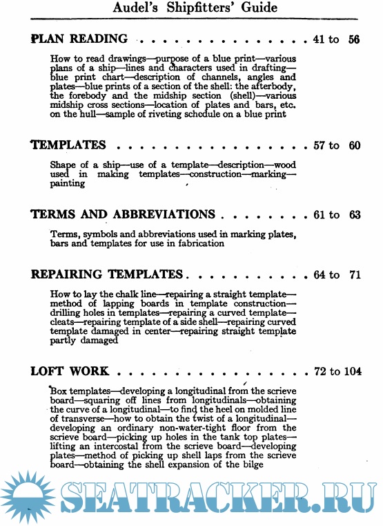 Description: Audel's ship fitters' guide; a practical treatise on steel ship building and repairing, with instruction in mold loft work, lifting, duplicating, including template making, plan reading, parts of a steel ship, terms and definitiions, developing plates and bars, shearing, beveling, scarphing, inserting liners, riveting and rivet tables.