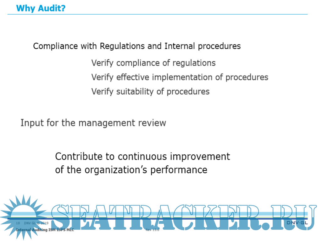 Year: 2019 Language: english Author: DNV-GL Maritime Academy Genre: Training courses Publisher: DNV-GL Maritime Academy Edition: Rev 13.0 Format: PDF Quality: eBook Pages count: 148 Description: Effective implementation and verification of a (safety) management system require periodical internal audits. The approach to and scope of an audit differs widely from an inspection. The requirements for auditing the management system within companies and onboard ships have highlighted the subject of competence of internal auditors. Our course provides you with the knowledge and expertise necessary to plan and conduct combined ISM, ISPS and MLC audits and verifications. Through the use of interactive group exercises, you will also improve your communication skills and thus strengthen your overall performance as an auditor. The first part of the auditing process resembles an inspection activity (verification of compliance and identification of non-conformities). This course will provide shipping and offshore company employees with the knowledge and tools necessary for performing and managing internal auditing procedures. Verification principles and methods for the implementation of both formal and informal audit procedures will be examined and applied. Participants will receive a sound understanding of auditing techniques and processes as well as management of an internal auditing program. They will also gain an appreciation for the role and importance of internal auditing programs within the maritime industry as related to Safety and Quality Management systems and learn about the requirements laid down in the ISO 19001 standard related to the performance of the internal audits and verifications in an integrated management system Additional info: Objectives To qualify participants as internal auditors (ISM, ISPS, MLC) enabling them to prepare and conduct internal audits/verifications within their shipping companies in accordance with accepted auditing principles. Prior knowledge of the three standards is expected