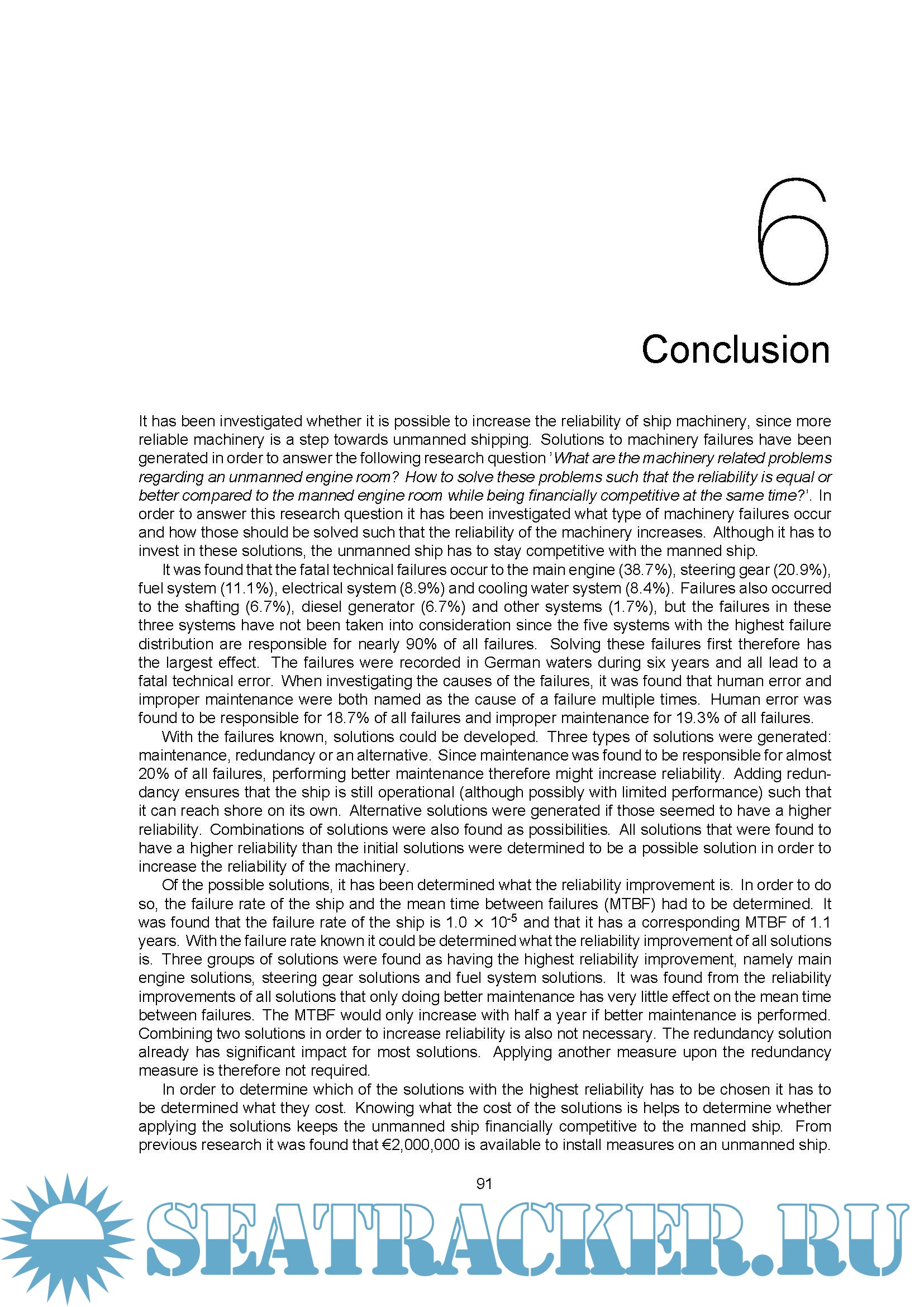 Description: Due to the increasing seaborne trade, shortage of officers, constant work of crew on machinery during voyage and the large contribution of human error to shipping accidents it is time for shipbuilding to take the next step in automation. Unmanned shipping is the way to move forward and since the engine room houses some of the most important machinery in the ship, this is the equipment which has to be made more reliable first. Improving the reliability of ship machinery is the goal of this thesis, and this will be done for ship types with a simple design and relatively simple equipment, namely general cargo ships, container ships, bulk carriers and oil and chemical tankers. In order to increase the reliability of the machinery, it will first have to be determined which failures occur to the machinery. The main engine, steering gear, fuel system, electrical system, cooling water system, diesel generator, shafting and other have all been found to be responsible for fatal technical failures in the past. Since these first five systems are responsible for the largest part of the failures, the focus of this thesis will be on these systems. These systems are crucial for the actual sailing of the ship, so making these systems more reliable makes great effort regarding unmanned sailing. With the failures known, solutions have been developed for each individual failure. These solutions should have an equal or higher reliability compared to the initial solution. For the found solutions it can then be determined what their reliability improvement is. Determining the reliability improvement is done by knowing the failure rate of the machinery, which has also been determined. A list can then be made to determine which solutions provide the most reliability improvement. The cost of the best solutions is calculated next. In order for the unmanned ship to sail the oceans in the near future, it has to be financially competitive to the manned ship. When looking at the causes of the failures it was found that human error and improper maintenance are both responsible for almost 20% of the failures. Performing better maintenance was though not found to realize much reliability improvement, just as an alternative solution was not found to realize much reliability improvement. Solving the maintenance related failures or choosing an alternative system is thus not the best solution to the failures. The best type of solution was found to be a type of redundancy. Solutions to the main engine failures, steering gear failures and fuel system failures were found to achieve the most reliability improvement. This was to be expected since these systems are also responsible for the highest number of failures. When making a ship unmanned, equipment such as accommodation, fresh water systems, HVAC and others do not have to be installed. Money that does not have to be spend on this equipment is the budget for the reliability solutions. The cost of the three solutions with the most reliability improvement was found to fit perfectly within the budget that is available. It can thus be concluded that it is possible to increase the reliability of ship machinery while staying financially competitive to the manned ship. Budget is then also still available to pay for other systems that are needed for unmanned shipping. Redundancy was found as being the best type of solution. If all the best solutions are applied, the machinery would have a mean time between failures of nine years. Finding solutions to the diesel generator failures, shafting failures and other failures is needed to increase the reliability even further. In order to improve the reliability of the machinery even further, more detailed failure data has to be known. Of half of the failures there is currently not enough information. Better knowledge of the failure distribution will help to determine better solutions. It also helps to know to what ship types these failures occurred to. Failures in redundant systems are not within the failure data. Having this data really helps to get a better view of the problem. Knowing what failures the crew prevents during operation and knowing more precisely which failures they induce also helps to get more detailed knowledge of the machinery failures. If better failure data is available, a more detailed failure rate can be determined. When it also known which level of reliability is required, the more detailed failure rate can be used to determine whether this level of reliability can be reached. The here named advises would though all require extra research and are therefore recommendations for future work.