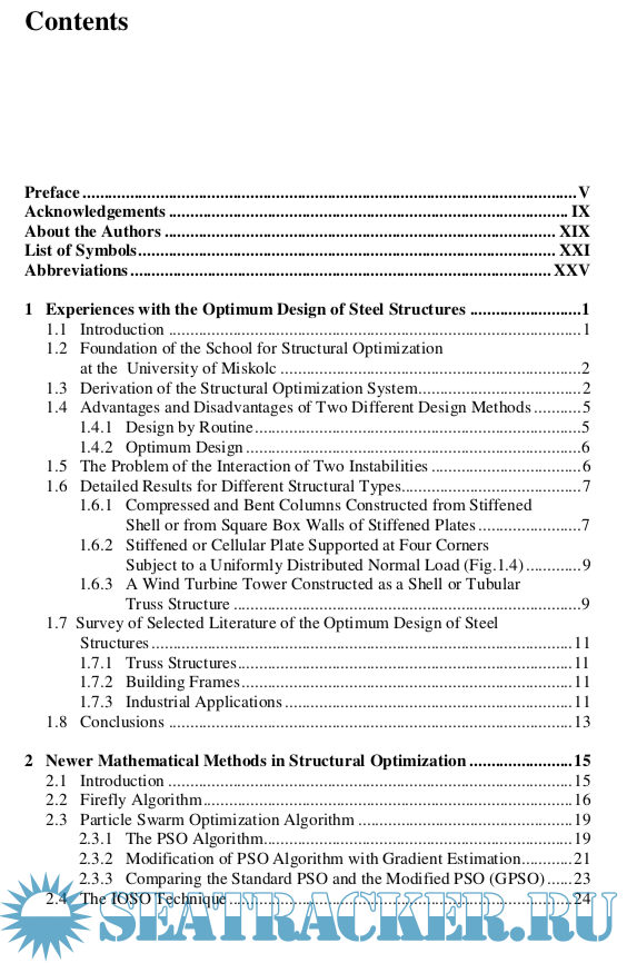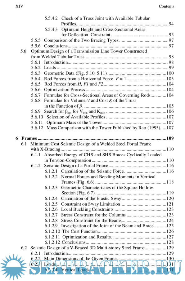 Year: 2013 Language: english Author: Dr. József Farkas; Dr. Károly Jármai Genre: Technical book Publisher: Springer ISBN: 978-3-642-36867-7 Format: EPUB Quality: eBook Pages count: 277 Description: The cost plays an important role in the design of engineering structures. This role can be illustrated by an example. In the design of a crossing over a big river the designer has two possibilities: design a number of small-span bridges with a number of basements or build a large-span bridge with only two basements. The cost comparison helps designers to select the cheaper version since the cost of basements depends on the quality of soil. In the case of welded structures the cost comparison helps to select the most economic structural version since the welding is an expensive fabrication technology. Our research has been focused on the use of the optimum design methods to minimize the cost of welded structures. This systematic research resulted in optimized structural types using realistic numerical problems. This book contains studies worked out during last five years and is a continuation of or books published in years 1984, 1997, 2003 and 2008. Studies on beams, tubular trusses, frames, stiffened plates and shells are grouped in separate chapters. Chapter 1 gives a survey on our experiences in the field of structural optimization. Separate chapters deal with the mathematical function minimization methods and the cost calculation. Our aim is to transfer the results of our research relating to the optimum design of steel structures, the ways to select the most suitable structural versions. This transfer is enabled by abstracts and conclusions of each section. The following studies on the optimum design for minimum weight or cost can be brought into prominence: Chapter 4: fire design of a welded box beam, Chapter 5: transmission line tower constructed as a welded tubular truss, Chapter 6: earthquake-resistant design of braced frames, Chapter 7: storage tank roof constructed from welded stiffened sectorial plates, Chapter 8: ring-stiffened cylindrical and conical shells. Structural optimization is a design system for searching better solutions, which better fulfil engineering requirements. The main requirements of a modern load- carrying structure are the safety, fitness for production and economy. The safety and producibility are guaranteed by design and fabrication constraints, and economy can be achieved by minimization of a cost function. The main aim of this book is to give designers and fabricators aspects for selection of the best structural solution. A lot of structural versions fulfil the design and fabrication constraints and designers should select from these possibilities the best ones. A suitable cost function helps this selection, since a modern structure should be not only safe and fit for production but also economic.