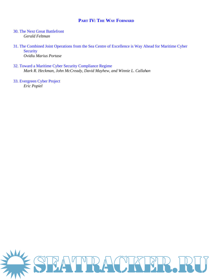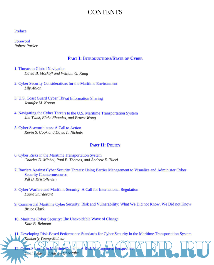 Year: 2017 Language: english Author: Fred S. Roberts Genre: Research papers Publisher: Westphalia Press ISBN: 1633915557 Format: PDF Quality: eBook Pages count: 380 Description: The world relies on maritime commerce to move exceptionally large portions of goods, services, and people. Collectively this effort comprises the Maritime Transportation System or MTS. A major component of this daunting multi-faceted enterprise are cyber networks, and the infrastructure they control. From the complex programs managing the loading and unloading of containers to waiting trucks, to the global navigation systems onboard vessels, to the hydraulic valves designed to protect spills into waterways that are located and controlled by cyber systems within chemical, water/wastewater, or petroleum plants, the MTS is becoming increasingly automated. The impact of the cyber element on the international MTS is significant. Yet, with the clear advantages this brings, come vulnerabilities and challenges. Researchers have demonstrated that it is possible to remotely take control of a vessel by spoofing its GPS. The news has reported attacks that shut down a boating oil rig by tilting it. The electronic positioning so ware systems on ships are vulnerable to attacks that could modify files and charts, causing potential for serious damage. The complexity of the problem of making our MTS safe from cyber attack is daunting, and the need for all stakeholders in both government (at all levels) and private industry to be involved in cyber security is more significant than ever as the use of the MTS continues to grow.