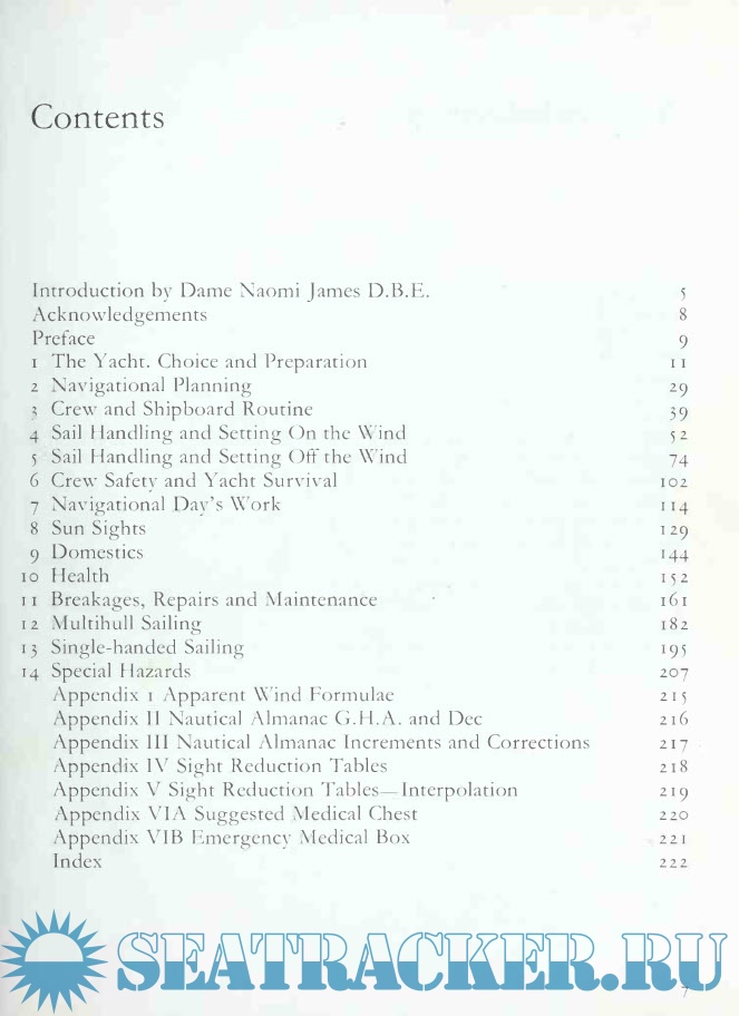 Year: 1980 Language: english Author: Robert James Genre: Guide Publisher: HEARST MARINE BOOKS Edition: First ISBN: 0-87851-311-6 Format: PDF Quality: Scanned pages Pages count: 227 Description: Trans-ocean sailing is easy to learn. The coastal sailor will find a logical extension of what he already knows and the novice will find it easier to master than inshore sailing. Out of sight of land one has more space and more time to get to know the sea in all its moods. There are no lee shores, rocks, tidal calculations or tricky harbour entrances to contend with. It is a mistake to believe that only the most experienced yachtsmen can successfully cruise or race across an ocean. A lifetime could be spent learning all there is to know about the sea, but how much of this is really essential ? Here lies the purpose of this book. From knowledge gained in many voyages, including two circumnavigations under sail via Cape Horn, I have sorted out what one actually needs to know to prepare for, and undertake, a long ocean voyage. The book covers the practical aspects of every stage of a trip—choosing the yacht, planning the route, shipboard routine, sail handling systems (cruising and racing), safety and survival procedures, navigation, food, health, repairs and maintenance and advice on a few special hazards. Also included are chapters on multihull and single-handed sailing.