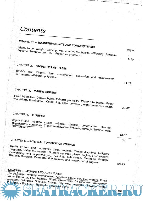 There are eleven major chapters in this book. The first chapter gives general information on the engineering units and terminology used. The second chapter describes the properties of gases, while the third chapter deals with the marine boilers including fire tube and donkey boilers, exhaust gas and water tube boilers, boiler corrosion problem etc. The next two chapters address the shipboard turbines and internal combustion engines.