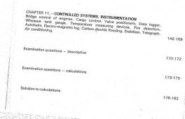 Then, there are three chapters devoted to the pumping arrangements and auxiliaries, refrigeration machinery and ship steering gear together with all parts. The rest of the document covers the shafting arrangements and propulsion, consumption of the fuel oil, fundamentals of control systems, instrumentation and other important aspects.