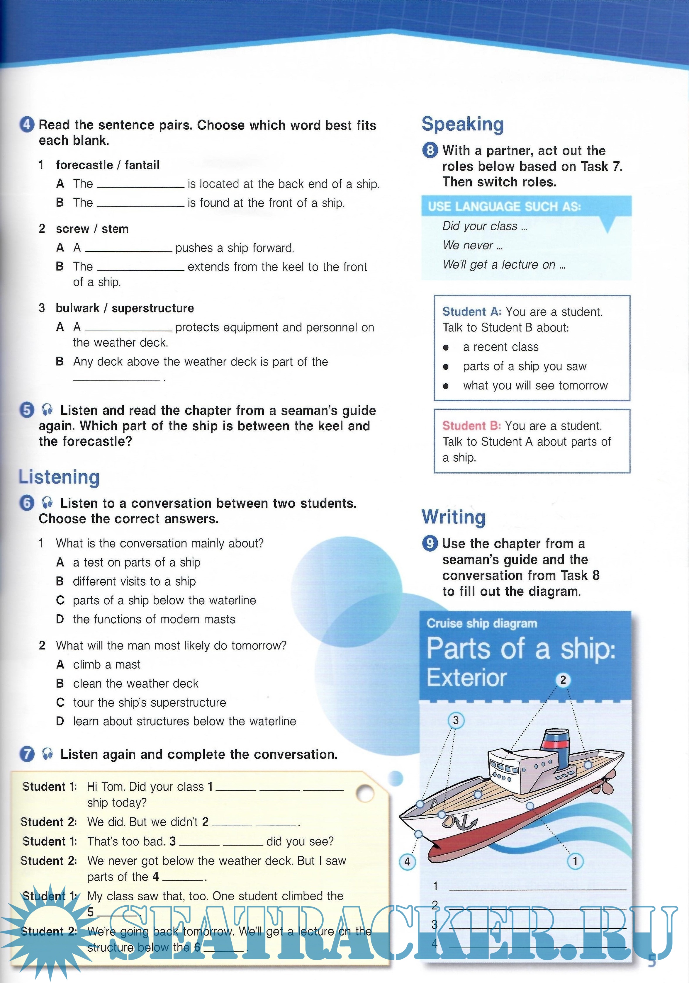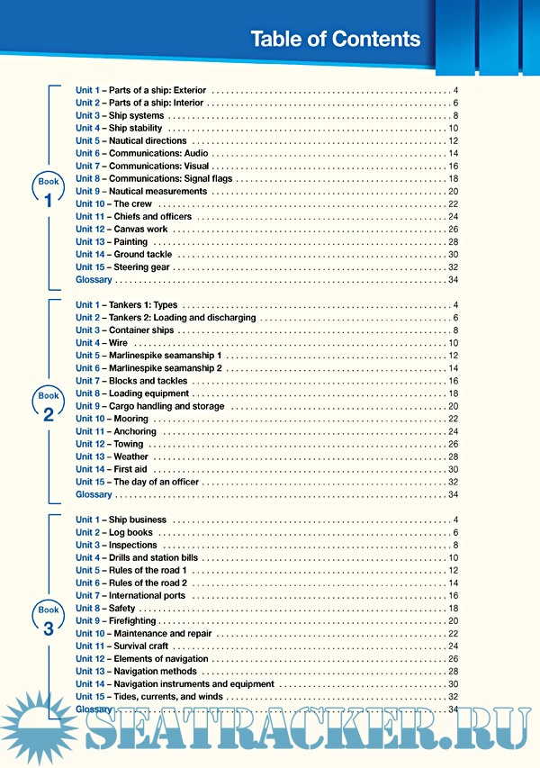 Description: Лексическое пособие для моряков торговых судов, которые хотят улучшить свои навыки общения на английском языке в рабочей среде. Пособие объединяет специализированную лексику и рабочий контекст на уроках английского языка, чтобы сформировать необходимые для карьеры языковые навыки. Охватывает широкий спектр тем, таких как части судна, типы торговых судов, морские узлы, морские направления, методы навигации и др.