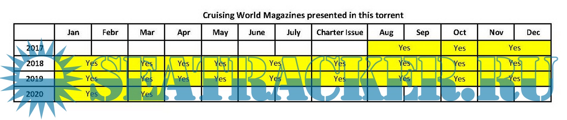Year: 2017-2020 Language: english Author: Mark Pillsbury - editor Genre: Periodical (magazine) Publisher: Bonnier Corporation Format: PDF Quality: Photo of pages Pages count: 100-170 Web: https://www.cruisingworld.com/ Description: Cruising World is your passport for exploring the world’s coastlines and oceans while voyaging under sail. Its contributors inspire and entertain through stories, pictures and videos that underscore the beauty and adventure of sailing, while providing instruction on the disciplines of seamanship, navigation and boat handling. The Cruising World community is made up of experienced, committed sailors and boat owners. No matter their long-range sailing plans, Cruising World’s mission is to nurture their dreams with practical how-to information and stirring real-life adventure features.