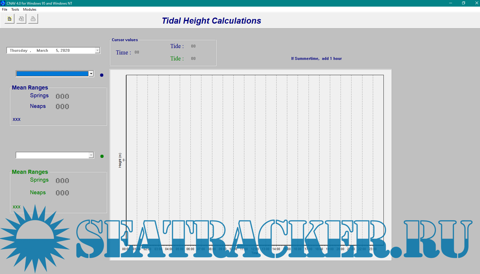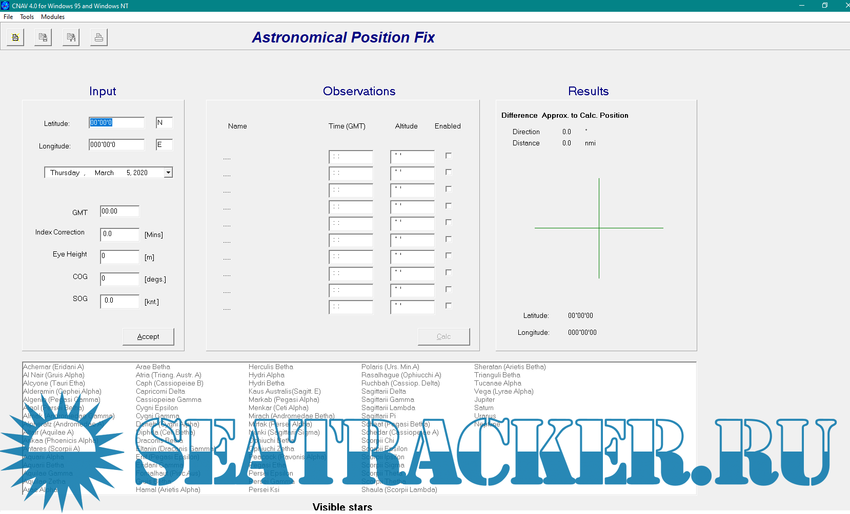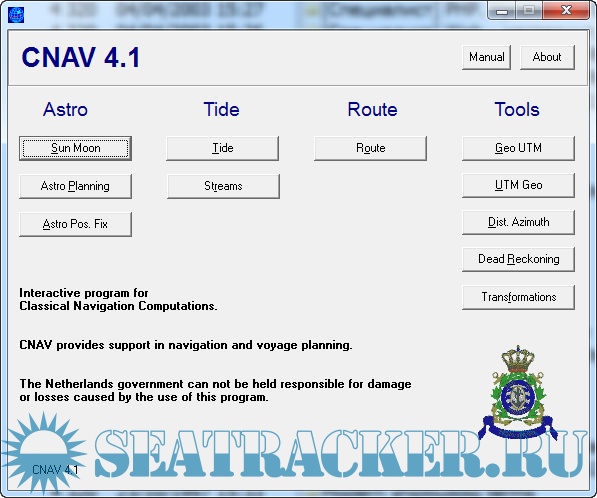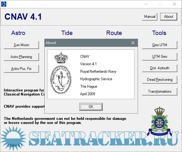 Description: CNAV 4.1 is a calculation software for Astro - Sun/Moon astro planning and position fixing, Tides and Streams, Routes and other tools. Works for every OS. CNAV 4.1 is a program which can show/calculate Sun/Moon Phenomena, Astro planning and astro position fix, Tidal height and stream calculations and etc. With CNAV 4.1, you can make quick and accurate calculations for traditional navigation. This includes calculations of course, distance, tides and celestial navigation for voyage planning and execution.