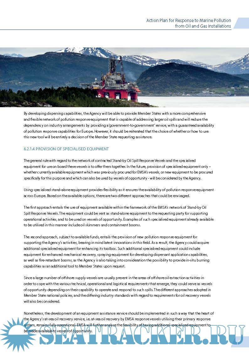 Description: EMSA's Action Plan covers the response to oil pollution caused by offshore installations. The response to pollution caused by gas installations is not addressed due to the particularities of such incidents. EMSA's expertise and response capabilities are primarily focused on oil pollution in the marine environment. Gas emissions may include liquid condensates, which evaporate into the atmosphere, with limited residues persisting on the water surface, meaning that on-site recovery is not feasible.