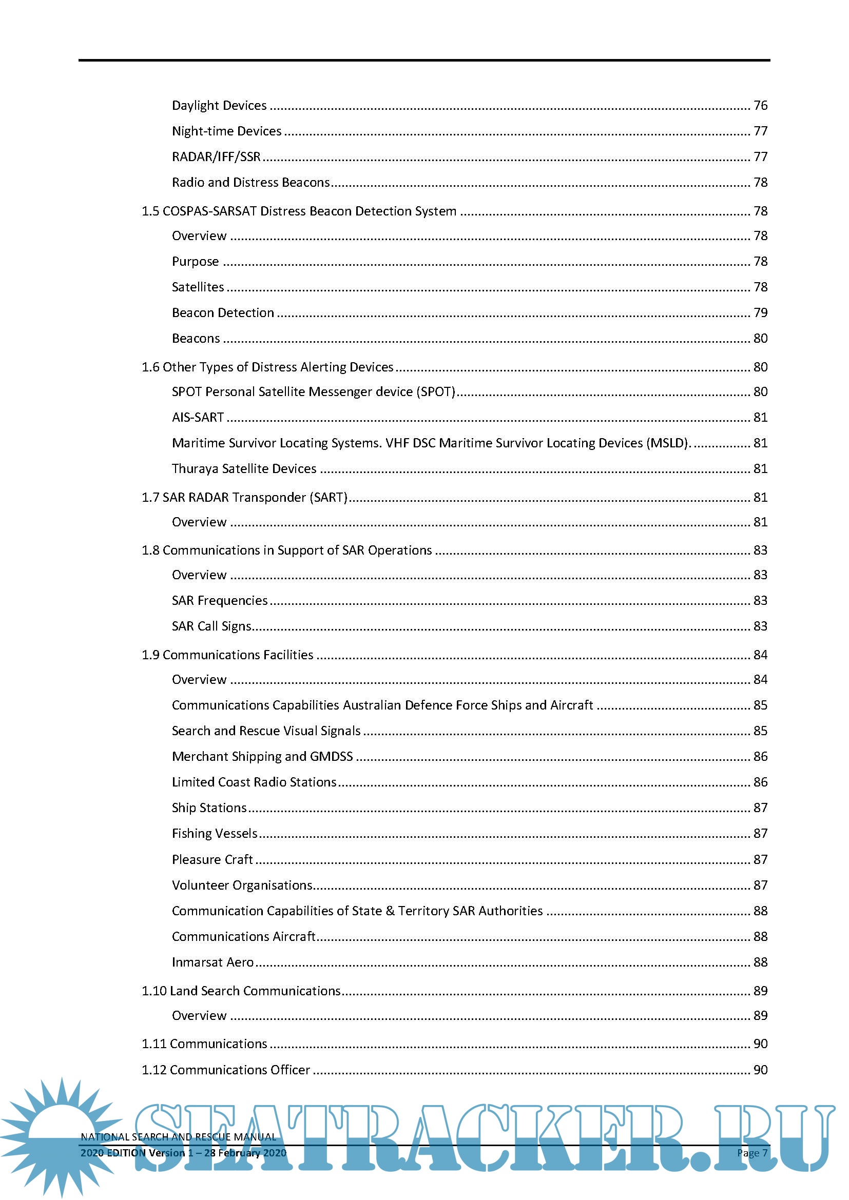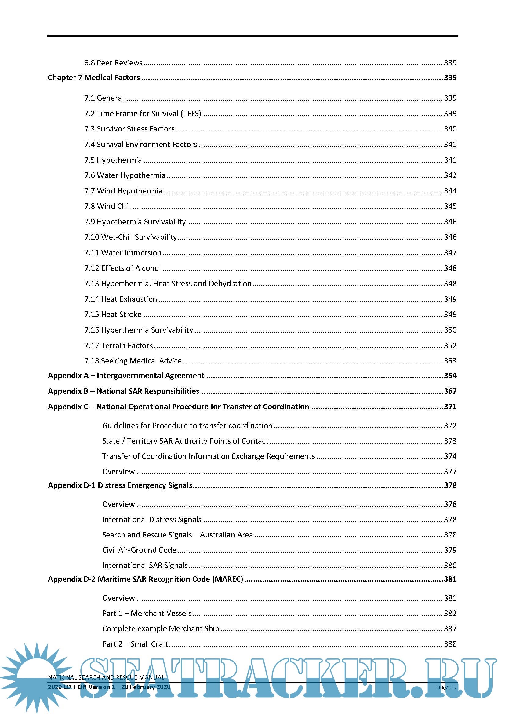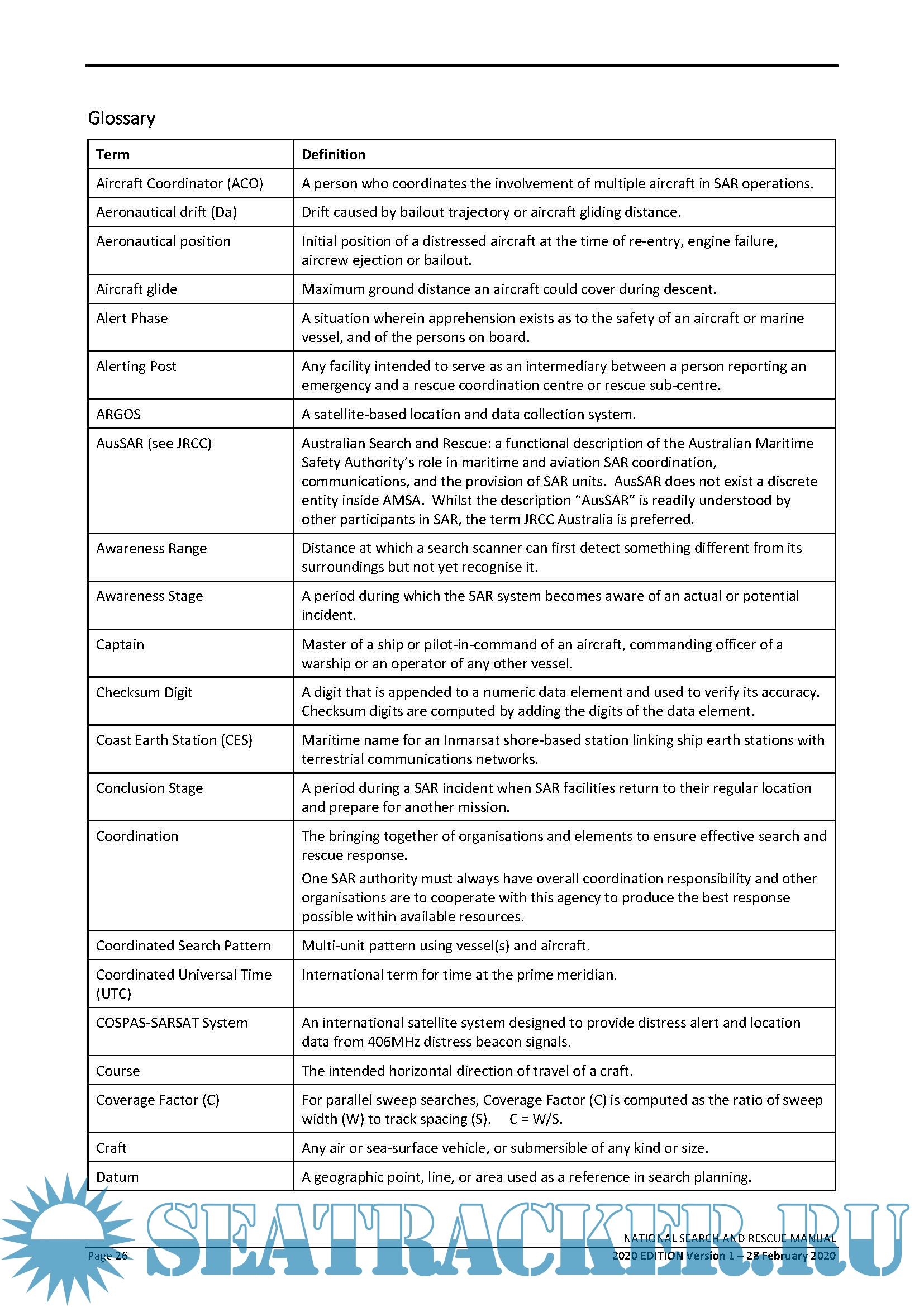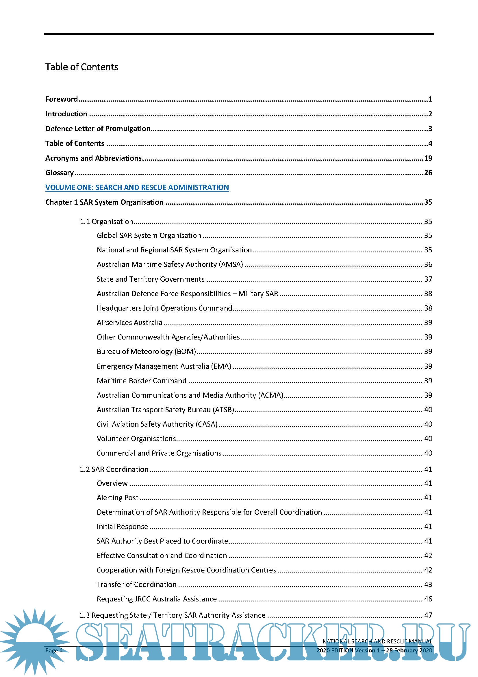 Description: This National Search and Rescue Manual is the result of the recent merger of the aviation, maritime and land search and rescue (SAR) manuals and is the standard reference document for use by all Australian SAR authorities. It is promulgated by the National SAR Council operating under direction from relevant Commonwealth, State and Territory Ministers. The Manual promulgates SAR coordination procedures for SAR operations conducted within Australia and the Australian SAR Region (SRR). The manual is consistent with the relevant International Conventions to which Australia is a party and is supplemented by various legal, informative and instructional documents used within, and between, organisations concerned with search and rescue. It has been developed with due regard to the International Aviation and Maritime Search and Rescue Manual (IAMSAR).