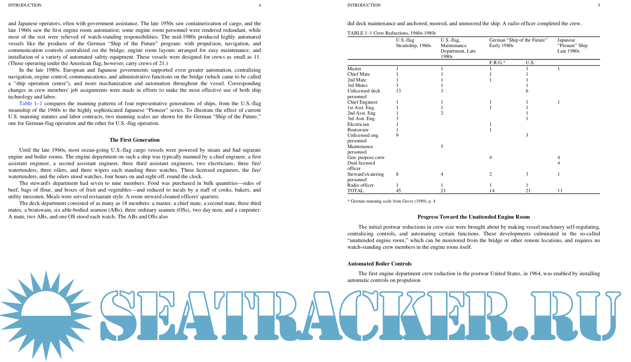 Description: Automation and mechanization of ships over the past three decades have resulted in continual reductions in the sizes of crews. Today the crew of a typical, recently built U.S.-flag vessel totals 20 to 24, compared with about 45 crew members 30 years ago. Some similarly designed foreign-flag vessels are manned by crews of 12 to 16. Highly automated foreign ships may operate with crews of 8 to 12.