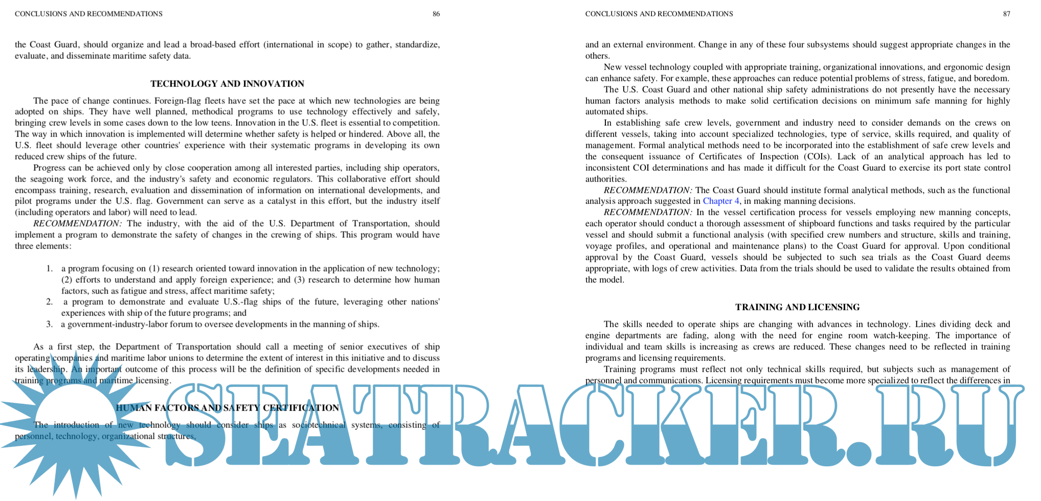 Year: 1990 Language: english Author: William M.Benkert et alli Genre: Reference book Publisher: National Academy Press ISBN: 0-309-04375-1 Format: PDF Quality: eBook Pages count: 184 Description: Automation and mechanization of ships over the past three decades have resulted in continual reductions in the sizes of crews. Today the crew of a typical, recently built U.S.-flag vessel totals 20 to 24, compared with about 45 crew members 30 years ago. Some similarly designed foreign-flag vessels are manned by crews of 12 to 16. Highly automated foreign ships may operate with crews of 8 to 12. Crew reductions accelerated in the 1980s as ship owners and operators throughout the world applied automation technology to make ships more efficient in the face of a serious shipping recession. The traditional shipping nations of Asia and northern Europe have been especially aggressive in substituting technology for personnel. Crew reductions by those national fleets came only after considerable study, review, and experimentation by the governments, operating companies, and labor organizations involved. The U.S. maritime industry has been slower to adopt these innovations. While the crew reductions recently realized in the United States, and more dramatically in other nations, have improved operating efficiency, they have also raised concerns about their impacts on vessel and personnel safety. The U.S. Coast Guard, responsible for the safety of waterborne commerce, requested that the National Research Council (NRC) assess the safety implications of recent sharp reductions in crew sizes and advise on ways to evaluate and improve the safety of different manning levels. Accordingly, the NRC's Commission on Engineering and Technical Systems (CETS) convened the Committee on the Effect of Smaller Crews on Maritime Safety. Committee members were selected for their expertise and to achieve balanced experience and viewpoints. (Biographical information about committee members is presented in Appendix A.) The principle guiding the constitution of the committee and its work, consistent with NRC policy, was not to exclude the bias that might accompany expertise vital to the study, but to seek balance and fair treatment. The committee operated under the auspices of the Marine Board, a unit of CETS.