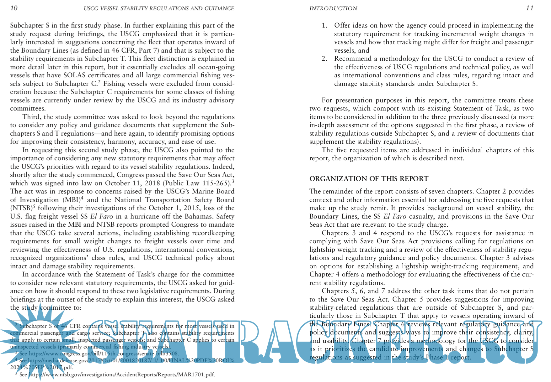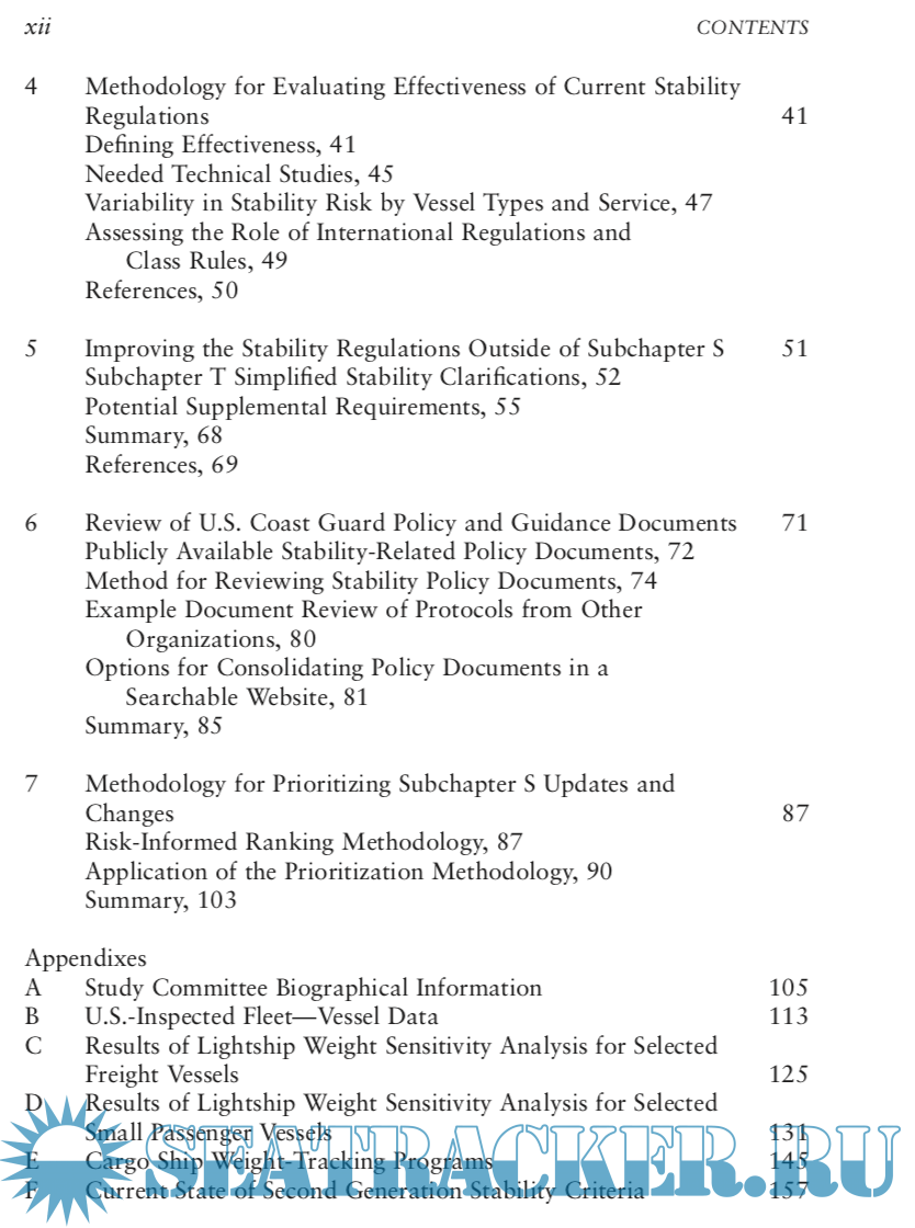 Description: In September 2017, the U.S. Coast Guard (USCG) Office of Design and Engineering Standards asked the National Academies of Sciences, Engineer- ing, and Medicine (the National Academies), through the Transportation Research Board’s (TRB’s) Marine Board, to review USCG regulations and policy documents that establish stability requirements for U.S. flag vessels. The USCG has the authority to inspect commercial vessels to ensure their safety under 46 U.S. Code Chapter 33. The associated regulations in 46 Code of Federal Regulations Chapter I contain requirements for vessel stability that apply to certain vessels used in commercial passenger and cargo service. Subchapter S is generally applicable to all vessels; Subchapter T applies to certain small, inspected passenger vessels; and Subchapter C applies to certain uninspected vessels (primarily commercial fishing industry vessels).