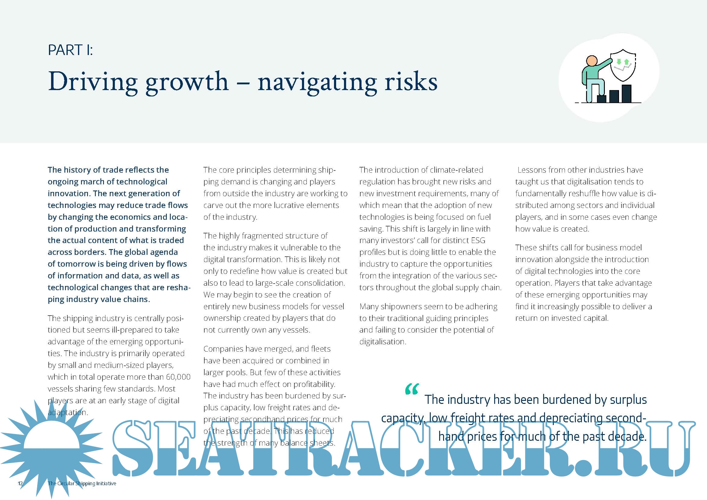 Year: 2019 Language: english Author: Danish Ship Finance, et al. Genre: Research papers Publisher: Danish Ship Finance, et al. Format: PDF Quality: eBook Pages count: 19 Description: Short-term tensions over trade, geopolitics and new environmental regulations are capturing the attention of the shipping industry, masking a more structural shift that is taking place. The introduction of new technologies, the digitalisation of interconnected global supply chains, and the transition towards a global circular economy will, at some point, change how value is created in the shipping industry. The shipping industry has been following a cost savings narrative during the past decade. The introduction of climate-related regulation seems to amplify this trend. The new regulation has introduced new investment requirements, many of which mean that the adoption of new technologies is being focused on fuel saving. But it becomes increasingly hard for individual players to develop a competitive edge if operational excellence is delivered through third-party algorithms or software available to all industry players. In many cases, these new technologies are simply redefining shipowners’ licence to operate. This shift is largely in line with many investors’ call for distinct ESG profiles but is doing little to enable the industry to capture the opportunities from the integration of the various sectors throughout the global supply chain. Additional value needs to be identified and new services need to be launched. Still, few of the traditional players are working to discover the revenue potentials in adjacent markets, different parts of the value chain, and new industries. The digital transformation of the global supply chain does not necessarily mean a sea change for every company in every part of the industry at the same time, although all ship segments are expected to be affected at some point. These trends are as likely to impact the container and the ro-ro players as the players operating tanker or dry bulk vessels. But the implications, the timing and the impact of these changes will vary greatly between ship segments. The introduction of circular business models represents an opportunity for differentiation and value creation in a period where the traditional guiding principles are slowly being corroded. The global supply chain is still at an early stage of digitalisation. Individual sectors are being upgraded and connected, but existing assets are for many reasons not being upgraded to the highest standards possible. The transformative effects of the emerging changes are therefore hardly visible yet, but the introduction of hyperconnectivity and embedded intelligence at the edge will work to integrate and optimise all elements of the global supply chain within the next decade. The Circular Shipping Initiative report, a project kindly financed by the Danish Maritime Fund, is intended to inspire and encourage further exploration of the circular economy and the opportunities it may present. We have only taken the first steps and invite readers to broaden the discussion, the perspectives and the possible future outcomes.