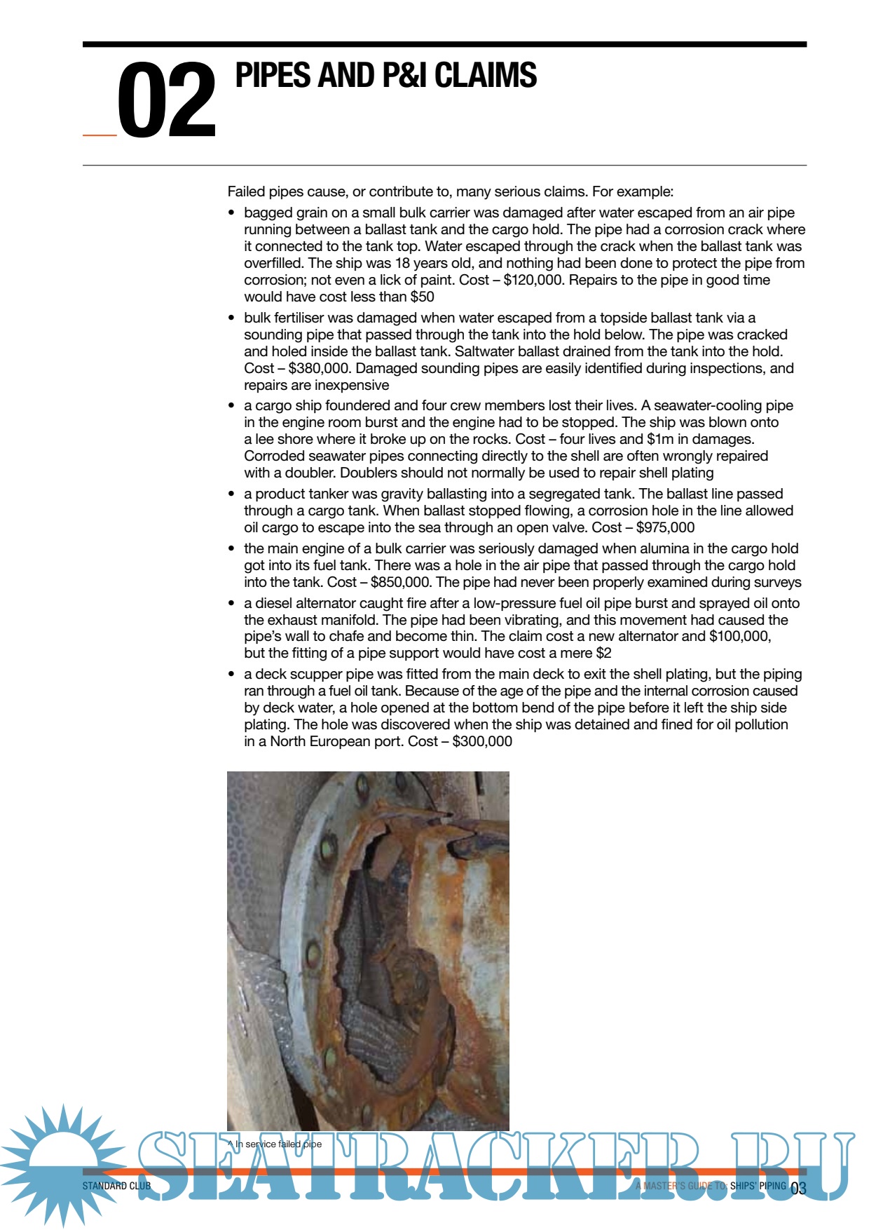 flooding or even total loss.The majority of ships’ pipes are constructed of ferrous material, which comes under attack from all forms of corrosion. As a ship ages, so does the piping system. Maintenance is not always easy, as pipes, unlike the hull, are difficult to examine because of their number and inaccessibility. It is practically impossible to maintain them internally and it is sometimes difficult to maintain a pipe’s external surface, where most corrosion usually occurs. As a result, pipes can receive minimal maintenance, and pipe failure is often the result.There is a cautionary tale about an operator who was once asked, when is it necessary to replace a pipe? His telling reply was, when it bursts. The purpose of this guide is to alert ships’ crews to the danger of catastrophic loss that can result from pipe failure. Our intention is to raise awareness of redundancy in pipe design and the difficulties involved in the surveying of