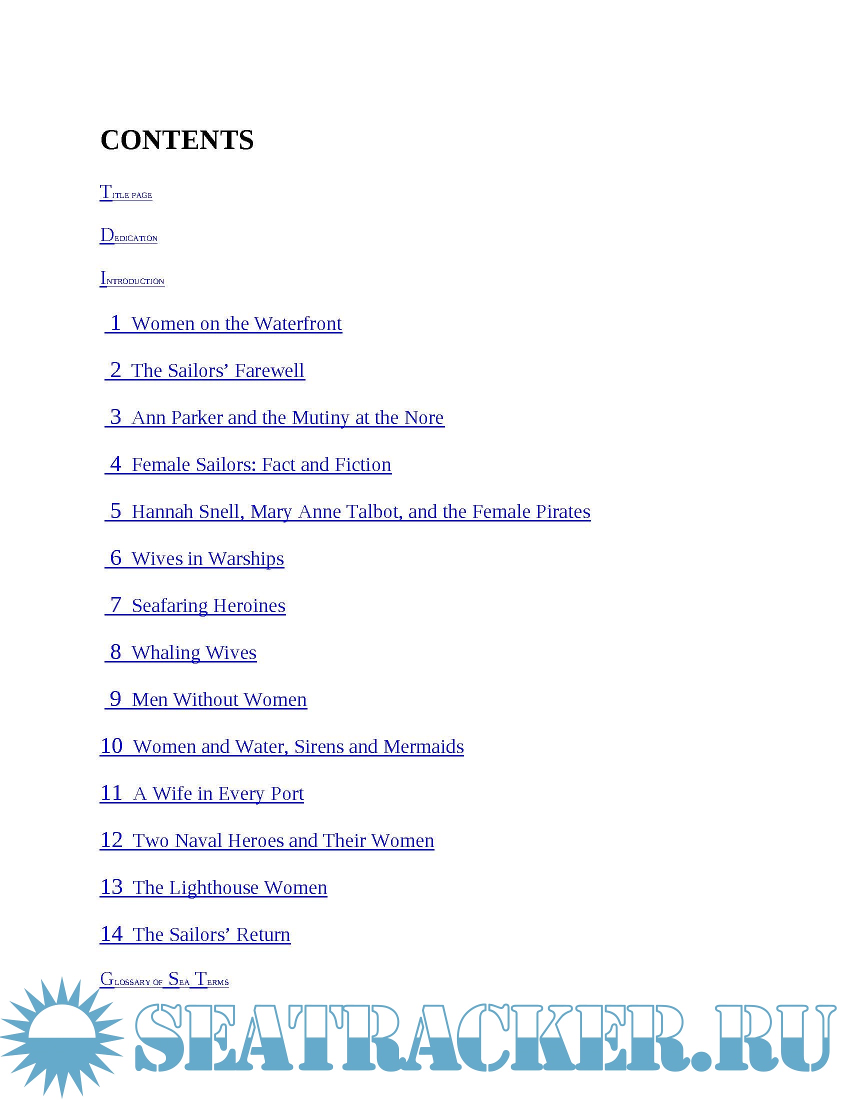 Year: 2001 Language: english Author: David Cordingly Publisher: Random House, Inc. ISBN: 978-0-37550697-0 Format: PDF Quality: eBook Pages count: 157 Description: For centuries the sea has been regarded as a male domain. Fisherman, navy officers, pirates, and explorers roamed the high seas while their wives and daughters stayed on shore. Oceangoing adventurers and the crews of their ships were part of an all-male world — or were they? In this illuminating historical narrative, maritime scholar David Cordingly shows that in fact an astonishing number of women went to sea in the great age of sail. Some travelled as the wives or mistresses of captains. A few were smuggled aboard by officers or seaman. A number of cases have come to light of young women dressing in men’s clothes and working alongside the sailors for months, and sometimes years. In the U.S. and British navies, it was not uncommon for the wives of bosuns, carpenters, and cooks to go to sea on warships. Cordingly’s tremendous research shows that there was indeed a thriving female population — from female pirates to the sirens of legend — on and around the high seas. A landmark work of women’s history disguised as a spectacularly entertaining yarn, Women’s Sailors and Sailor’s Women will surprise and delight readers.