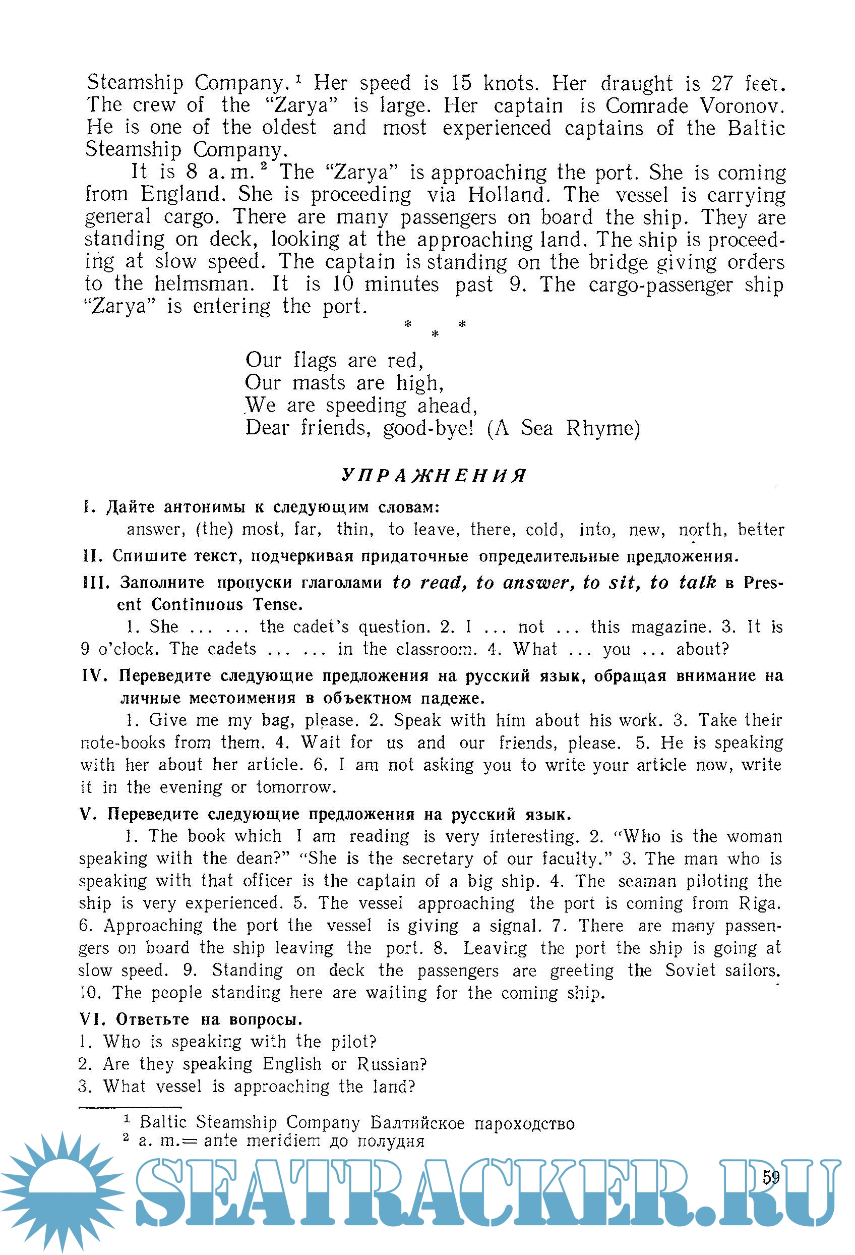 Перед курсантами морских училищ наряду с задачей овладения чтением и переводом английской литературы стоит также задача овладения навыками устной речи, что вытекает непосредственно из специфики работы на морском флоте. Плавание в иностранных водах и необходимость общения с представителями портовых, таможенных и других властей зарубежных стран требует от работника морского флота широкого и ответственного использования английского языка.
