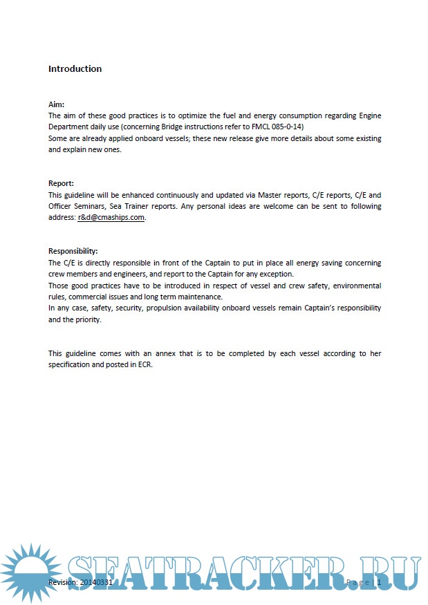 Year: 2014 Language: english Author: CMA-CGM Genre: Practical guide Format: PDF Quality: Unknown Pages count: 8 Description: The aim of these good practices is to optimize the fuel and energy consumption regarding Engine Department daily use.