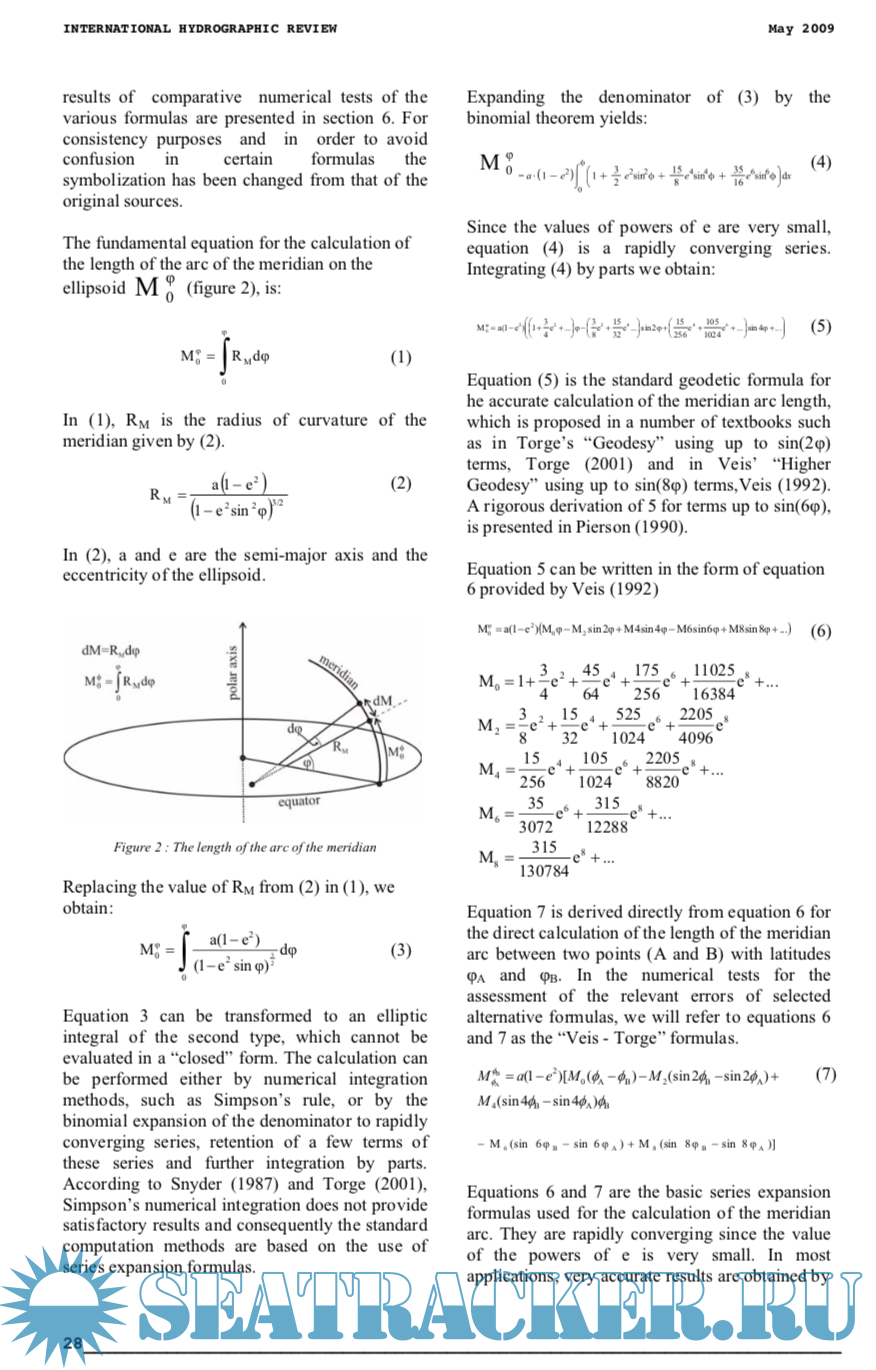 Year: 2009 Language: english Author: Athanasios Pallikaris et alli Genre: Research papers Publisher: International Hidrographic Review Format: PDF Quality: eBook Pages count: 11 Description: This paper presents simple compact formulas for the computation of the length of the meridian arc. The proposed alternative formulas are to be primarily used for accurate sailing calculations on the ellipsoid in a GIS environment as in ECDIS and other ECS. Their validity and effectiveness in terms of the accuracy achieved and the CPU time required are assessed and compared to standard geodetic methods. The results of this study show that the proposed formulas are simpler, shorter and more than twice as fast as other geodetic methods of the same accuracy, used for sailing calculations on the ellipsoid, such as “rhumb-line sailing” and “great elliptic sailing”.