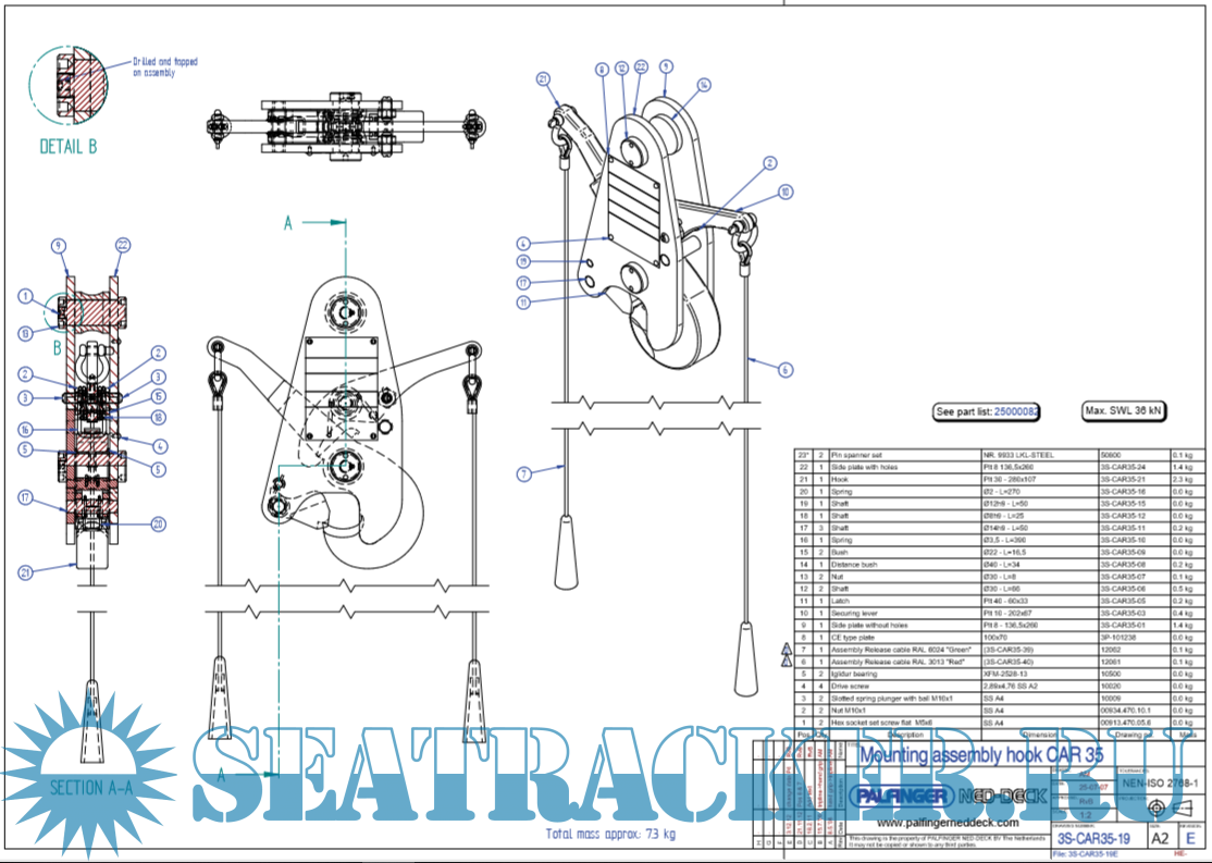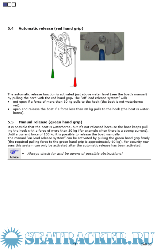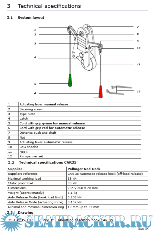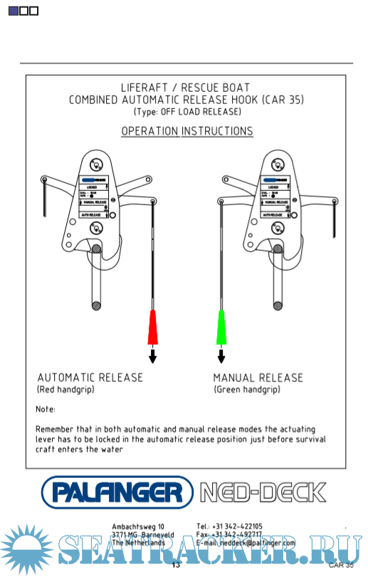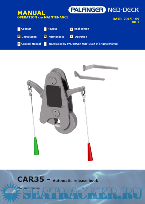 Description: Palfinger NED-Deck - Liferaft Davit Hook CAR 35 Release Hook Manual for training and education purposes.