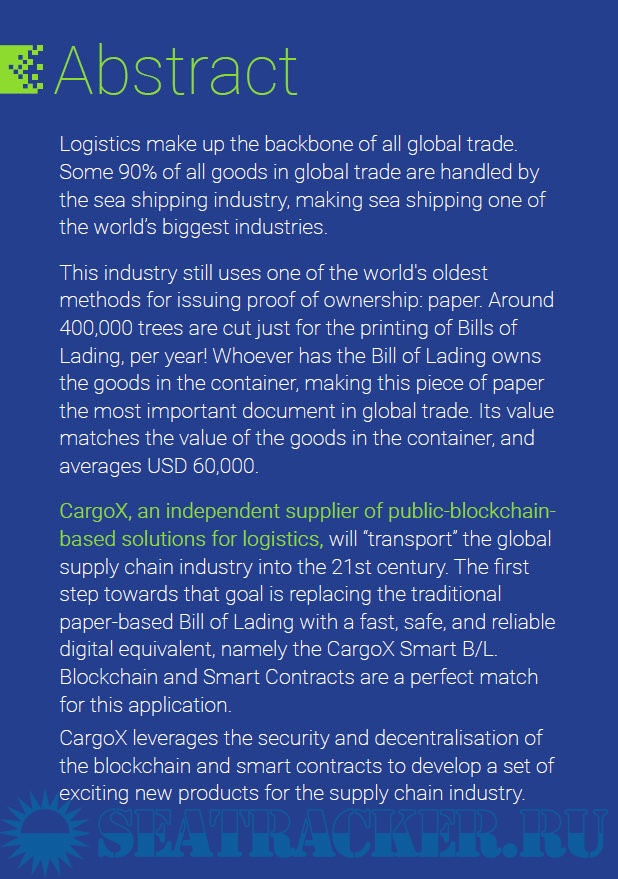 Description: CargoX, an independent supplier of public-blockchain-based solutions for logistics, will “transport” the global supply chain industry into the 21st century. The first step towards that goal is replacing the traditional paper-based Bill of Lading with a fast, safe, and reliable digital equivalent, namely the CargoX Smart B/L. Blockchain and Smart Contracts are a perfect match for this application.