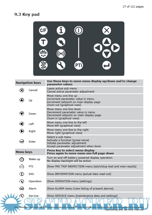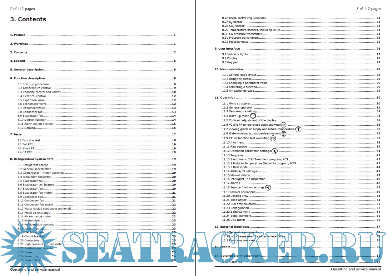 Year: 2019 Language: english Author: Maersk Container Industry AS Genre: Manual Format: PDF Quality: eBook Pages count: 114 Description: This version of the manual is dated June 2019, manual is valid for: Model SCI - 20/40/CA and SCU - 20/40 Software version 0356 The unit consists of the following modules: • Frame module • Condenser/compressor module • Evaporator module • Evaporator fan module The cooling system of the unit is equipped with a two–stage compressor, electrically driven through a frequency converter.