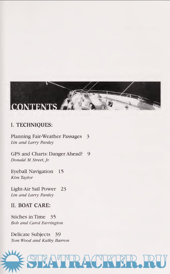 Year: 2001 Language: english Author: Patience Wales Genre: Handbook Publisher: Sheridan House Edition: First ISBN: 1-57409-121-2 Format: PDF Quality: Scanned pages Pages count: 211 Description: From choosing a crew for cruising to passage planning, from light air sails to navigation, this anthology of 28 articles from Sail Magazine gives practical advice on numerous aspacts of cruising.