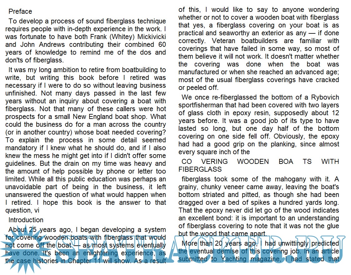 Year: 1989 Language: english Author: Allan H. Vaitses Genre: Guide Publisher: International Marine Edition: First ISBN: 978-0877429975 Format: EPUB Quality: eBook Pages count: 165 Description: Explains the advantages of applying a fiberglass coating to wooden boats, offers a step-by-step demonstration of the procedure, and shares the case histories of some fiberglassed boats