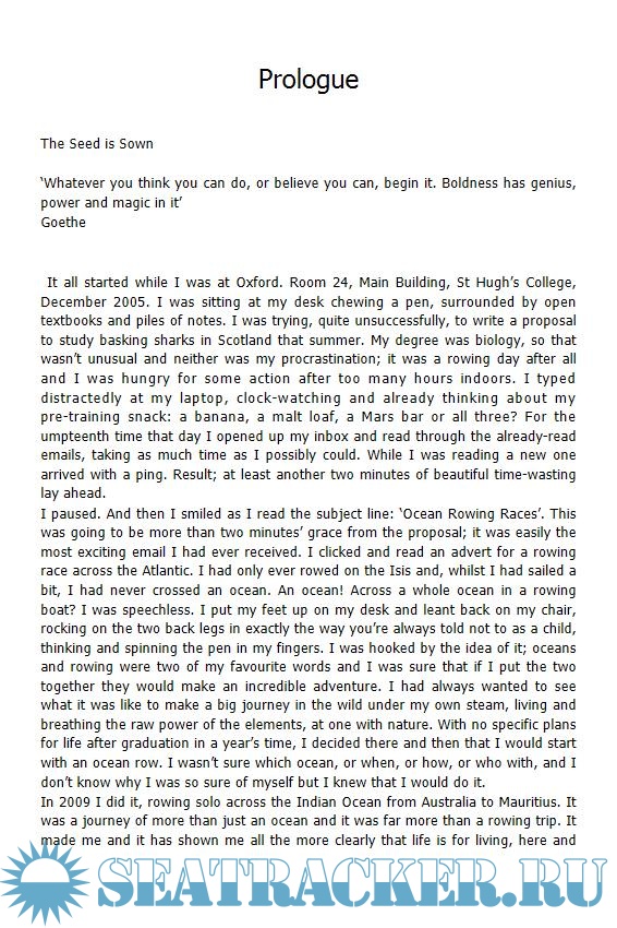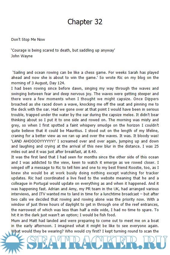 Year: 2011 Language: english Author: Outen S. Genre: History Publisher: Summersdale ISBN: 978-1848394490 Format: EPUB Quality: eBook Pages count: 320 Description: Four-thousand miles of unpredictable ocean, 500 chocolate bars, 124 days of physical exertion, three Guinness World Records, and one incredible journey. On April 1, 2009, brave 23-year-old Sarah Outen embarked on an ambitious solo voyage across the Indian Ocean in her rowing boat, Dippers. Powered by the grief of the sudden loss of her father and the determination to live life to the fullest, Sarah and her tiny boat successfully negotiated wild ocean storms, unexpected encounters with whales, and the continuous threat of being capsized by passing container ships. Along the way she broke two oars, ate 500 chocolate bars, and lost 20 kg of bodyweight before arriving in Mauritius. She became the first woman and the youngest person to row solo across the Indian Ocean. Life-affirming, funny, and poignant, Sarah's salty tale of courage and endurance will inspire the taste of adventure in everyone.