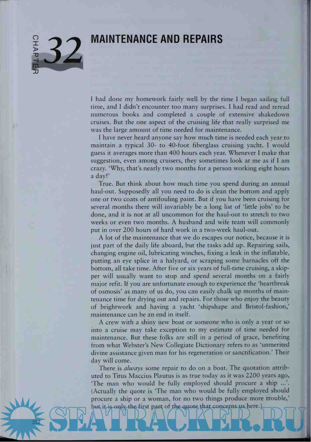 Year: 2000 Language: english Author: Howard J. Genre: Handbook Publisher: Sheridan House Edition: 2nd ISBN: 978-1-57409-093-2 Format: PDF Quality: Scanned pages Pages count: 501 Description: Turn your dreams of sailing to distant shores into reality. With the detailed, firsthand information in this encyclopedic volume, you'll find all you need to know about selecting, fitting out, maintaining and handling a bluewater cruising boat. In the few years since publication of the first edition, the Handbook of Offshore Cruising has become recognized as the standard reference work for bluewater sailors. It is especially useful for those planning extended offshore cruising in mid-size sailing vessels. For easy reference, this handbook is divided into four parts: The Boat, the Systems and Equipment, the Voyage and In Port. Part 1, The Boat, consists of eleven chapters, ranging from building or buying a boat and choosing the rig to construction materials and deck, cockpit and cabin layout. Part 2, Systems and Equipment, covers the engine, electrical systems and the latest electronics, plumbing, self-steering systems as well as cruising sails and magnetic steering compasses. Parts 3 and 4 include everything about the voyage and what to do in port. Heavy weather at sea and in port are also given careful attention. The author has practical advice on trip planning, provisioning, maintenance and repairs; the important topic of anchors and anchoring is given a thorough treatment. The psychological aspects of cruising, the need to maintain good health, the need for security, and how to get along in other cultures are topics also covered. Handbook of Offshore Cruising contains forty chapters including all relevant topics for extensive offshore cruising. Fifteen comprehensive appendices complete this important manual. The 75 drawings by Tadami Takahashi provide clear guidance by illustrating technical points; some have an unusual beauty of their own. This is the book every cruiser needs, now fully updated and with a new section of spectacular photos by Onne van der Wal — don't leave port without it! Additional info: About the Author Jim Howard has cruised the great oceans of the world for over 30 years, often singlehanded. Charles J. Doane has had articles published in SAIL, Cruising World and other sailing magazines.