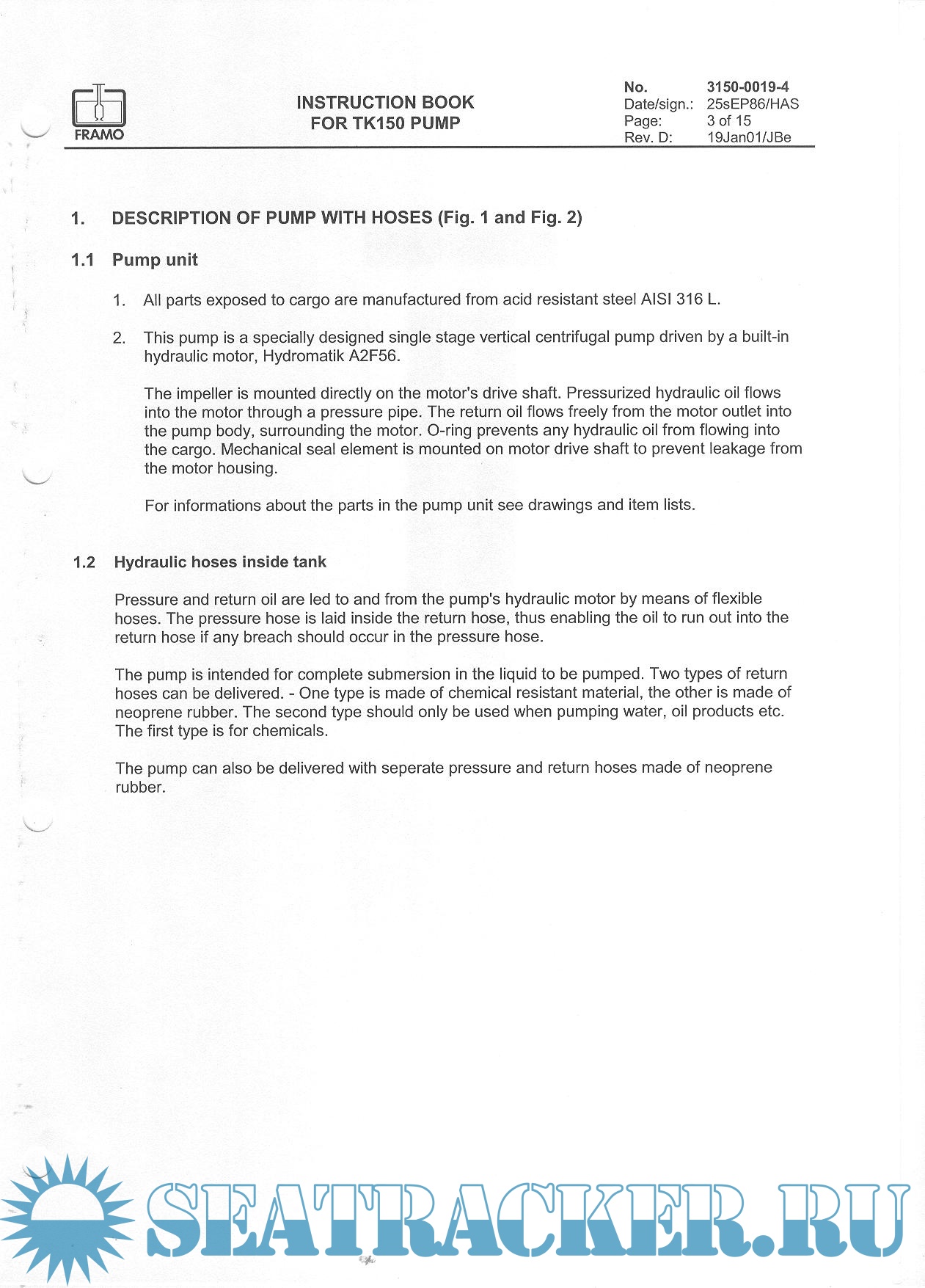 Year: 2005 Language: english Author: Frank Mohn Services AS Genre: Manual Publisher: Frank Mohn Services AS Edition: 2005 ISBN: 0242-011-4 Format: PDF Quality: Scanned pages Pages count: 312 Description: The Framo cargo pumping system is designed for a long life and reliable operation. To obtain this long life it is important that the system is operated according to the intentions. Further, the specified preventive maintenance must be carried out and the cleanliness level in the hydraulic system must be kept within acceptable limit. For maximum efficiency, operate as few power packs as possible, maintaining the required oil flow. Hydraulic system pressure should be kept to a minimum above the requirements to the highest consumer. Operation of the pumps to be within the capacity range. In case of low discharge pressure, observe for abnormal noise and vibration. Reduce the hydraulic pressure until stable condition is obtained. Only qualified personnel should operate the system, thus ensuring a safe and economic operation. Necessary training is owner's responsibility. Framo may offer several alternatives for technical training. System adjustments and service work should only be performed by a Framo service engineer, or by qualified members of ship’s crew. Overspeed (tripping) of the Framo cargo pumps cannot occur due to the speed control valve - STC (Speed Torque Controller). This valve is limiting the hydraulic oil flow to the pump's motor and consequently the maximum speed. The maximum oil flow is adjusted by Framo, and the adjustment screw is sealed. Overspeed is impossible as long as this seal is unbroken. If the seal is broken, warranty claims will be refused. Dry running situations may occur during stripping and tank cleaning operations. The bearings in the Framo cargo pump is lubricated and cooled by the hydraulic return oil, which means that the pump can run dry without any damage to the pump. However, unnecessary dry running should be avoided. The hydraulic return oil temperature is also a bearing monitoring system. An alarm will be activated if the hydraulic oil temperature exceeds 60°C. The Framo pumps can be run against closed cargo valve without any risk of eventual overheating as the wear ring loss is lead directly back to the tank. Additional info: I truly appreciate any "Thank U" given to me, if this release helps you.