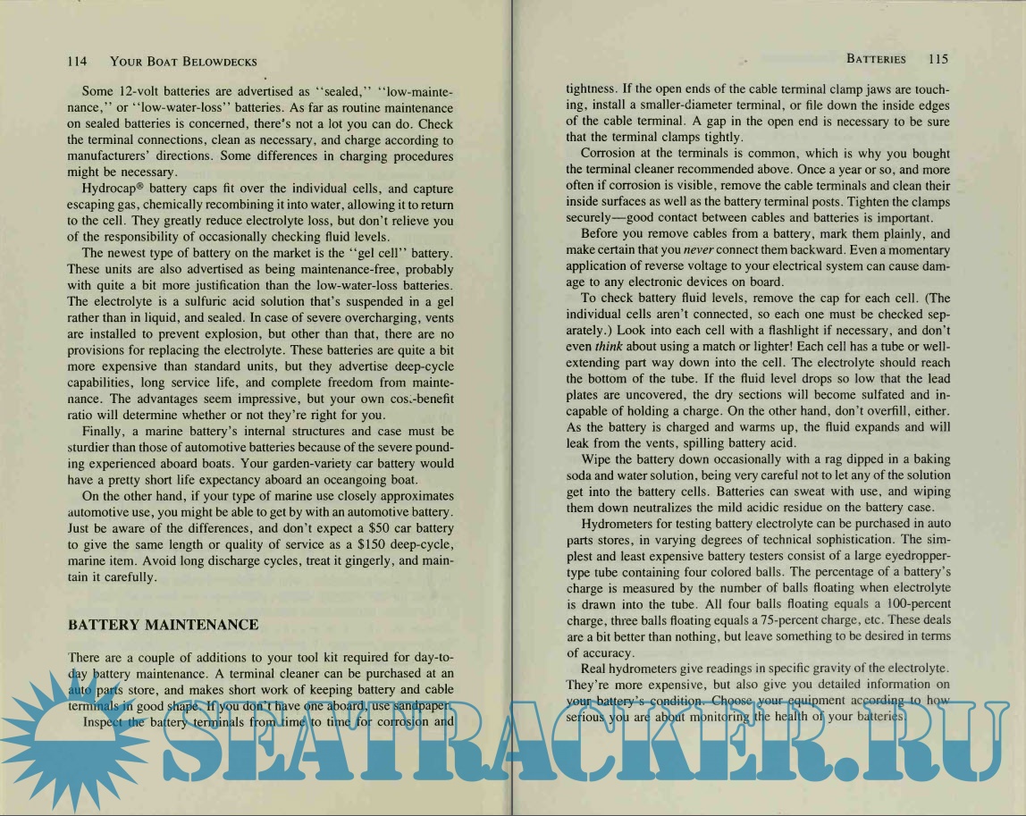 Year: 1990 Language: english Author: Thomas Reale and Michael Johnson. Genre: Guide Publisher: HEARST MARINE BOOKS Edition: First ISBN: 0-688-08338-2 Format: PDF Quality: Scanned pages Pages count: 264 Description: This practical guide is written for the non mechanic, and the authors begin by telling the reader what tools are needed for each job and exactly how to use them. The lively step-by-step instructions are easy to follow and are illustrated with dozens of line drawings, photos, diagrams, and tables. Your Boat Belowdecks successfully fills a gap in today's maintenance books by focusing exclusively on below decks systems, the "guts" of a boat—and the most crucial and potentially expensive to fix. In straightforward language, the authors explain how to troubleshoot, maintain, and repair engines, diesel fuel systems, batteries, filters, pumps, steering, stoves and heaters, and more. Beginning with the symptoms, they explain how to narrow down the possible causes, isolate the malfunction, and repair or replace the faulty part. Reale and Johnson carefully guide the reader through all the necessary steps and explain the purpose of each bolt or wire or fuse, cautioning against common mistakes and mishaps all the while.