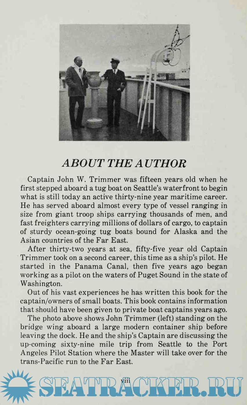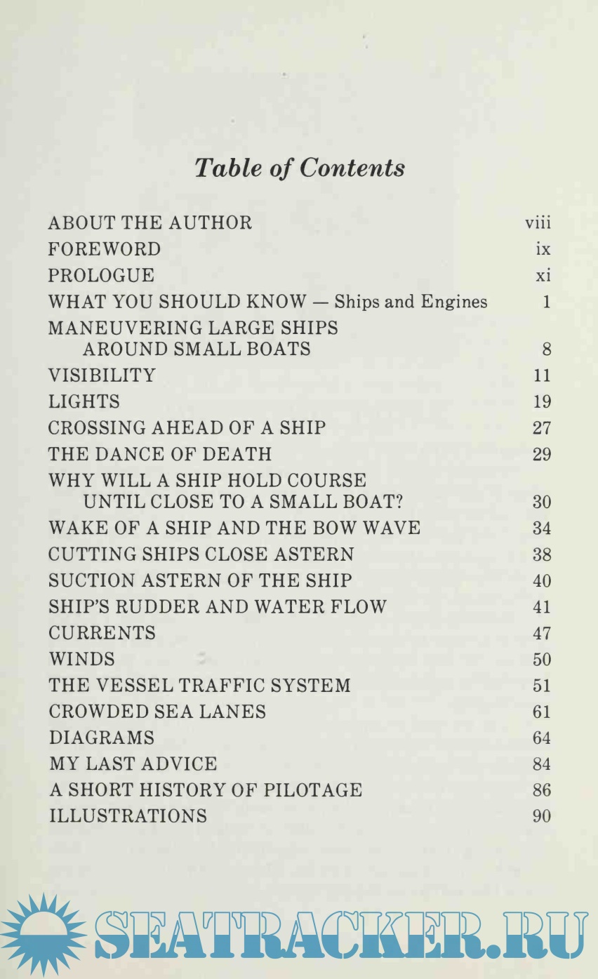 Over the years I have looked in vain for a book I could buy and give to my boating friends: a book they could carry with them and use at the scene as they forged into the shipping lanes of the nation's harbors, bays and waterways, a busy place where the ships hurriedly plow their way back and forth to the ocean from whence they came. I hope this publication will give the captain of a smaller vessel some degree of assurance that what he is doing around these deep draft vessels will prevent his craft from ever coming close to being run down by some over-size ship. I pray it will keep you and yours out of harm's way!