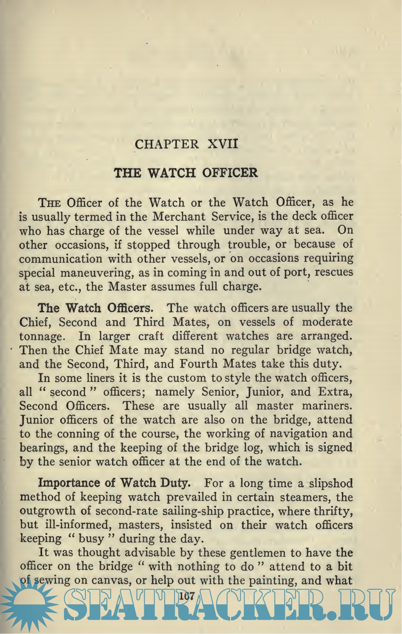 Year: 1918 Language: english Author: Felix Riesenberg, C.E. Genre: Technical book Publisher: D. Van Nostrand Company Format: PDF Quality: Scanned pages Pages count: 354 Description: The Men on Deck - Master, Mates and Crew. Their Duties and Responsibilities IN the days of sail, the duties of masters, mates, and crews, were well defined. Sea practice, in the various rigs, had become standard with the authority of an ancient calling. The art of sailing, and of rigging ships, was a precise matter. Gear remained standard for a century. The main to'bowline of a Black Ball Liner, tearing to windward in a North Atlantic hummer, was rove and led in much the same fashion as the main to'bowline of the ships of Nelson and Van Tromp. And the old time seamen, in their usage and habits, followed the regularity of the ships upon which they sailed. The gradual transition from sail to steam carried with it, for a time, the old system of sailing ship routine. But to-day the sailing ship sailor is a thing of the past; the works of steam and steel are upon the waters we are in the age of engines and the engineer. Great problems of mechanical propulsion, and of construction, are constantly presenting themselves, and the successors of the ancient mariner, the modern master, mates, and crew; the " deck department," if you will, of the present day steamer, find themselves afloat with different gear and under different conditions every time they change vessels. No standard form of sea training has yet come to take the place of the old-time apprentice system of sail, and in addition to ships that are far from standard, we find that many ideas prevail as to the duties and organization of the seamanship branch of the modern steamer.