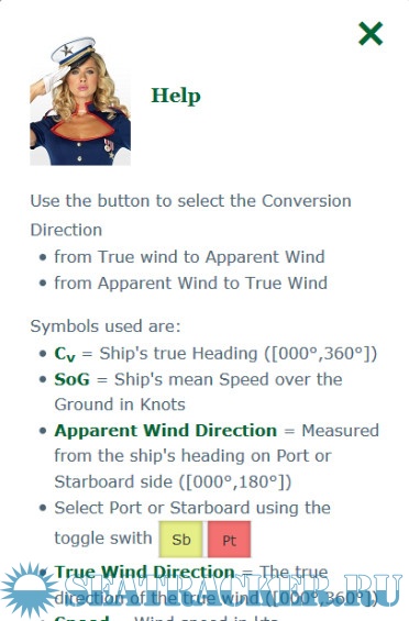 You can also convert true wind to apparent wind. The calculator has a help page which clearly explains all symbols used.