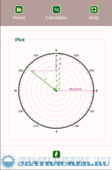 The power of this calculator is the graphical solution or plot, clearly showing how wind vector and ship movement vector are added as a vector sum. Make sure you understand this plotting technique very well.