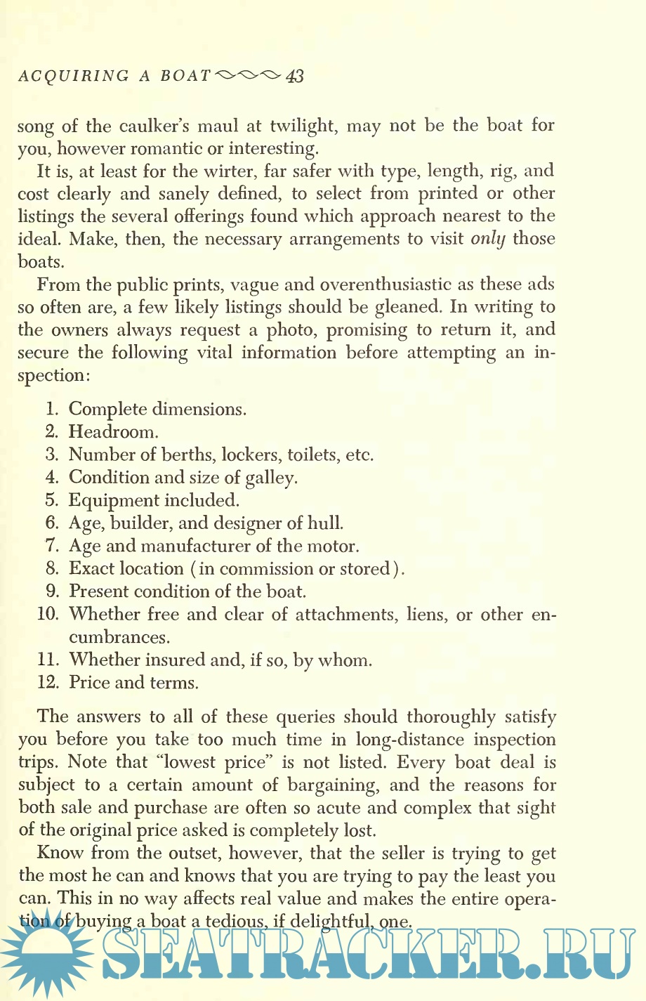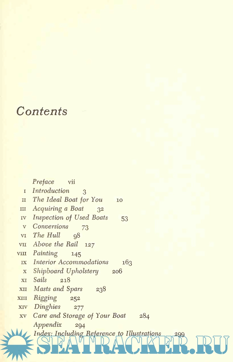 The fifteen chapters discuss in shipshape language, with plenty of diagrams and drawings, the ideal boat for each man's purpose, the details of acquiring a boat, how to inspect a boat, conversions, the hull, decks and deck structures, painting, interior accommodations, shipboard upholstery, sails, masts and spars, rigging, dinghies, as well as care, maintenance, storage, and laying up. The author, a veteran yachtsman, bases his discussion on many years' experience in actual building and sailing small boats.