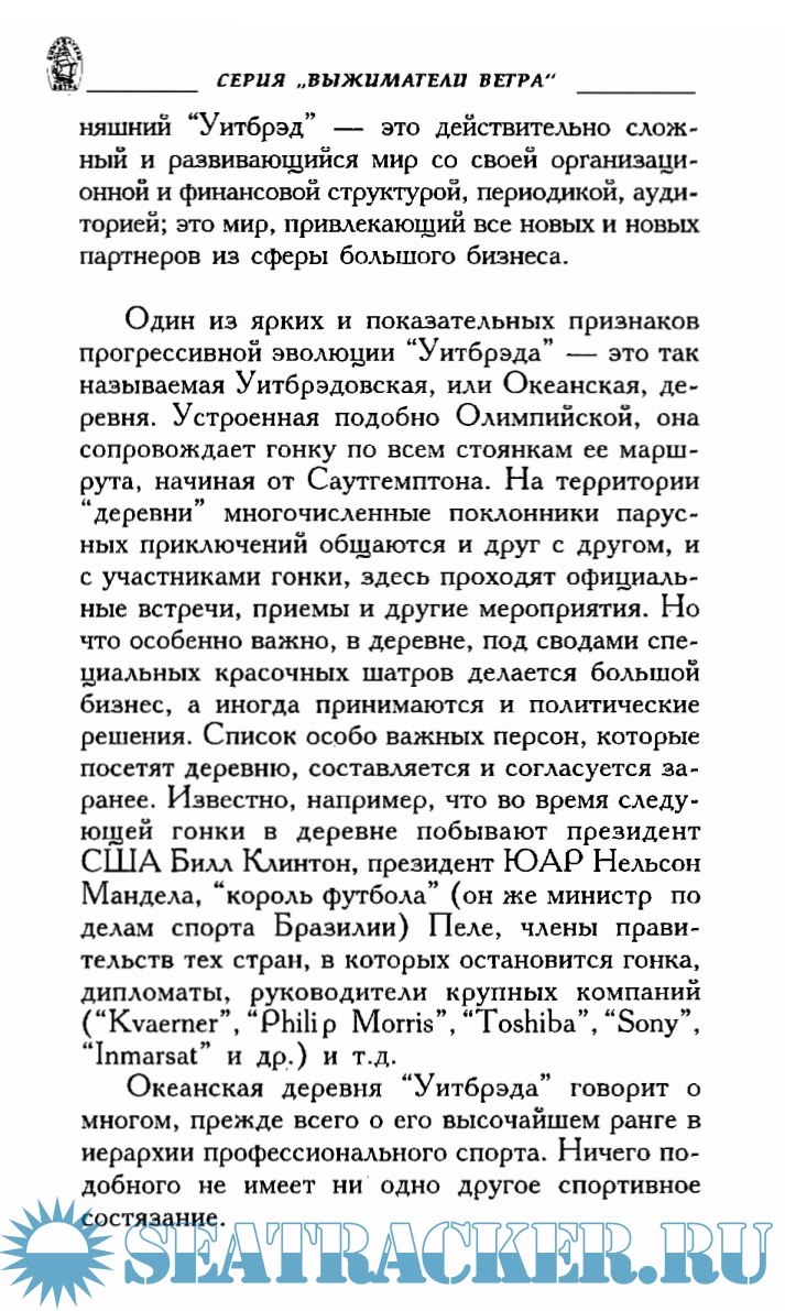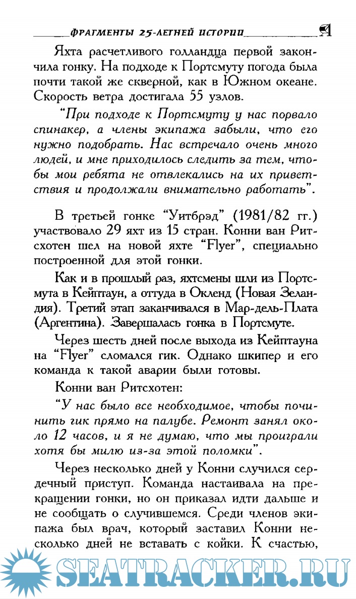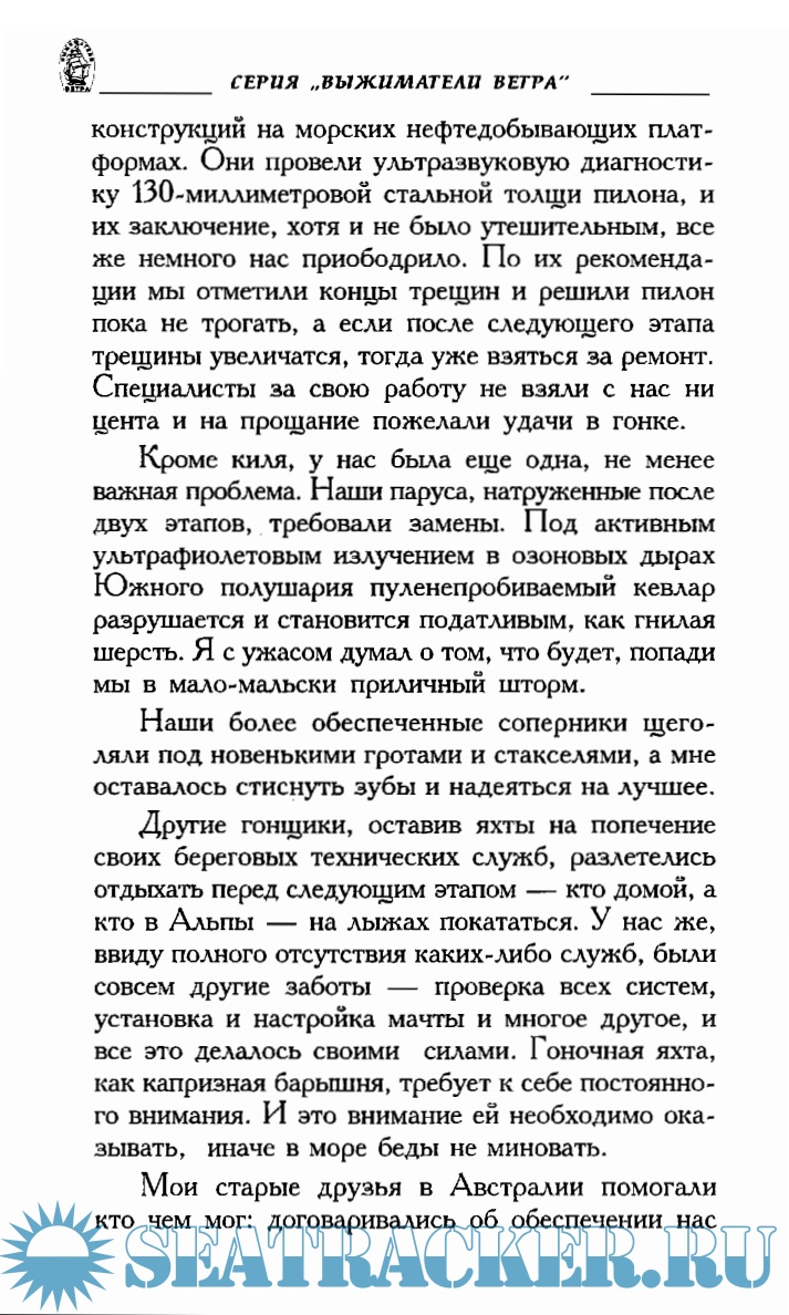 Описание: Книга повествует о самом захватывающем, жестком и длительном состязании на Земле - кругосветной гонке парусных яхт Уитбрэд. Современные "выжиматели ветра" за 9 месяцев преодолевают 33 тыс. морских миль. По степени риска эта профессиональная гонка не имеет себе равных. Главное в Уитбрэде - победить, сохранив при этом тело, корабль и твердость духа. Борьба ведется ежесекундно, не прерываясь ни днем ни ночью.