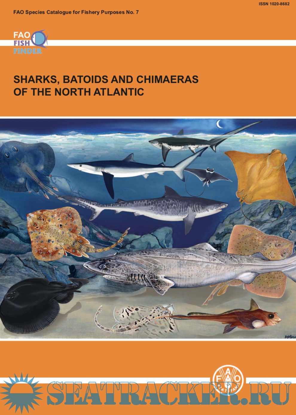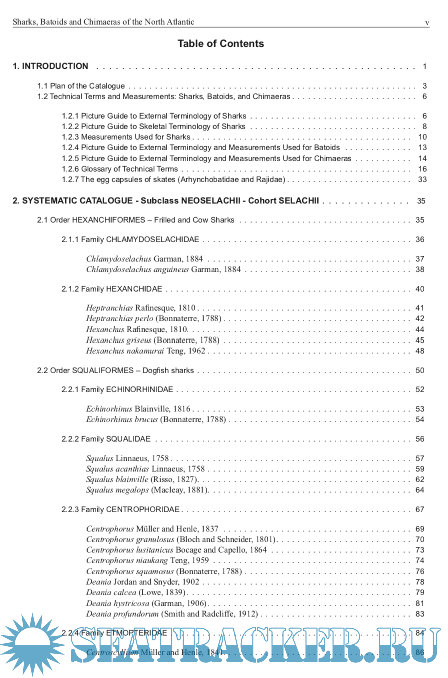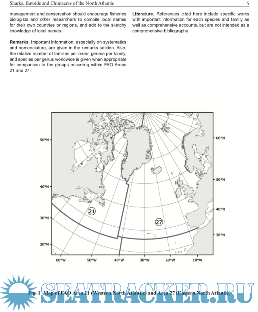 Description: This catalogue covers all the described species of living sharks, batoids, and chimaeras found in the North Atlantic, FAO Areas 21 and 27. The catalogue is intended to be a comprehensive review of the shark-like fishes of the North Atlantic in a form accessible to fisheries workers as well as researchers on shark systematics, biodiversity, distribution, and general biology. It also caters to other researchers that need comparative information on sharks, and their relatives, and to people who encounter sharks during the course of work or play in the sea, or in freshwater, and the general public. It includes species of major, moderate, minor, and minimal importance to fisheries as well as those of doubtful or potential use to fisheries. It also covers those species that have a research, recreational, educational, and aesthetic importance, as well as those species that occasionally bite and threaten people in the water and the far more numerous species that are ‘bitten’ and threatened by people through exploitation and habitat modification.