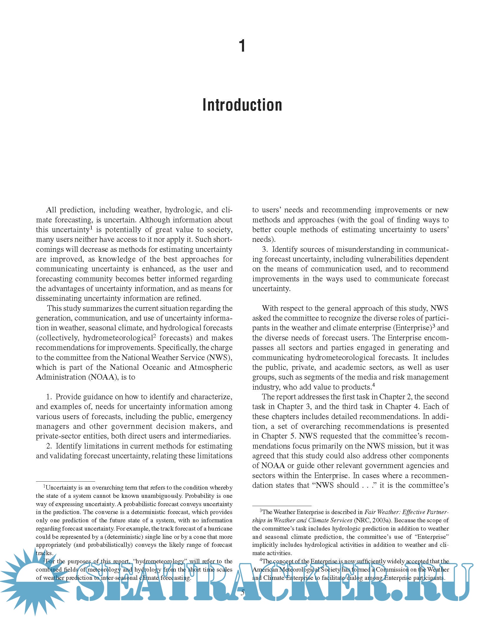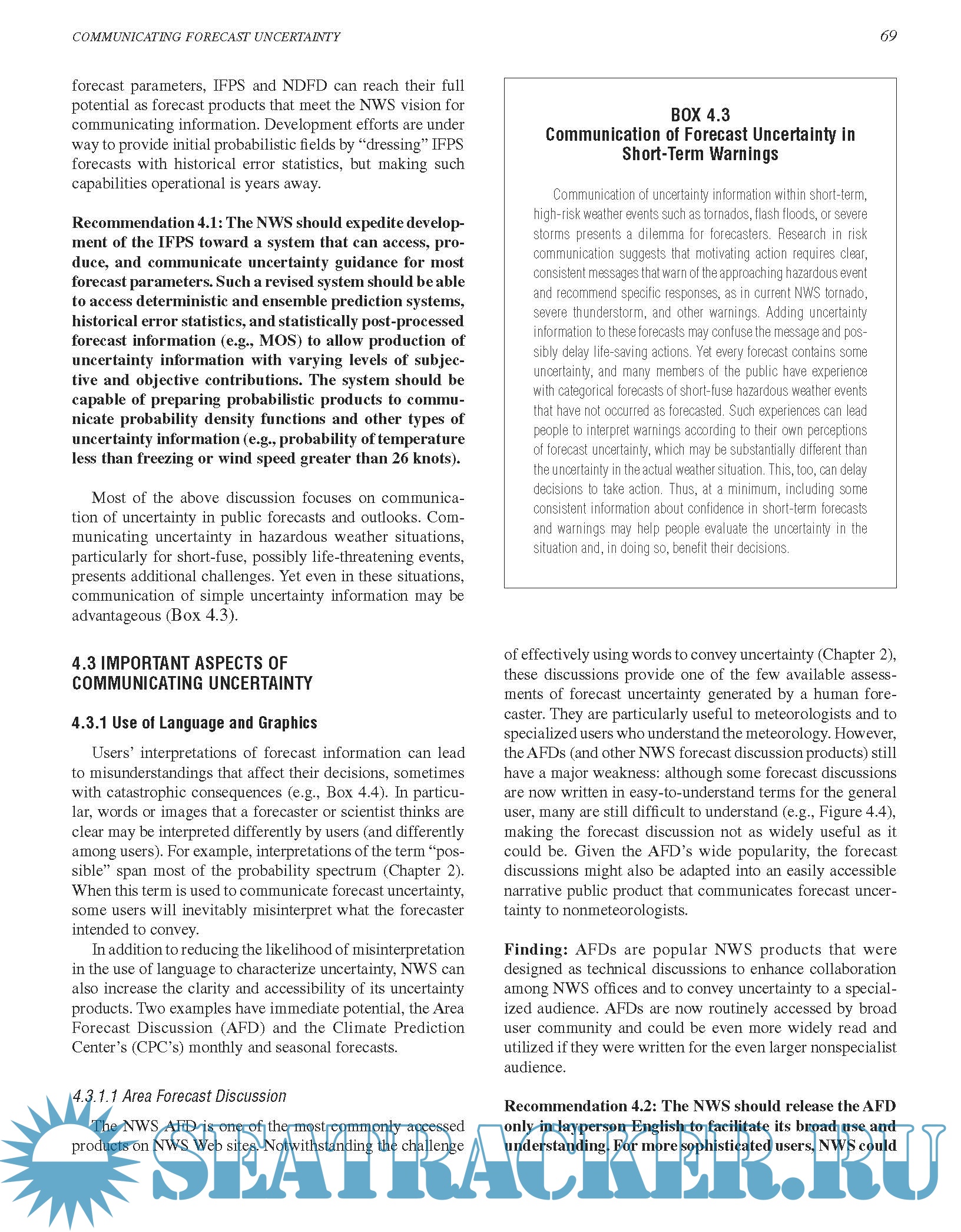 Description: Uncertainty is a fundamental characteristic of weather, seasonal climate, and hydrological prediction, and no forecast is complete without a description of its uncertainty. Effective communication of uncertainty helps people better understand the likelihood of a particular event and improves their ability to make decisions based on the forecast. Nonetheless, for decades, users of these forecasts have been conditioned to receive incomplete information about uncertainty. They have become used to single-valued (deterministic) forecasts (e.g., "the high temperature will be 70 degrees Farenheit 9 days from now") and applied their own experience in determining how much confidence to place in the forecast. Most forecast products from the public and private sectors, including those from the National Oceanographic and Atmospheric Administration’s National Weather Service, continue this deterministic legacy. Fortunately, the National Weather Service and others in the prediction community have recognized the need to view uncertainty as a fundamental part of forecasts. By partnering with other segments of the community to understand user needs, generate relevant and rich informational products, and utilize effective communication vehicles, the National Weather Service can take a leading role in the transition to widespread, effective incorporation of uncertainty information into predictions. "Completing the Forecast" makes recommendations to the National Weather Service and the broader prediction community on how to make this transition.