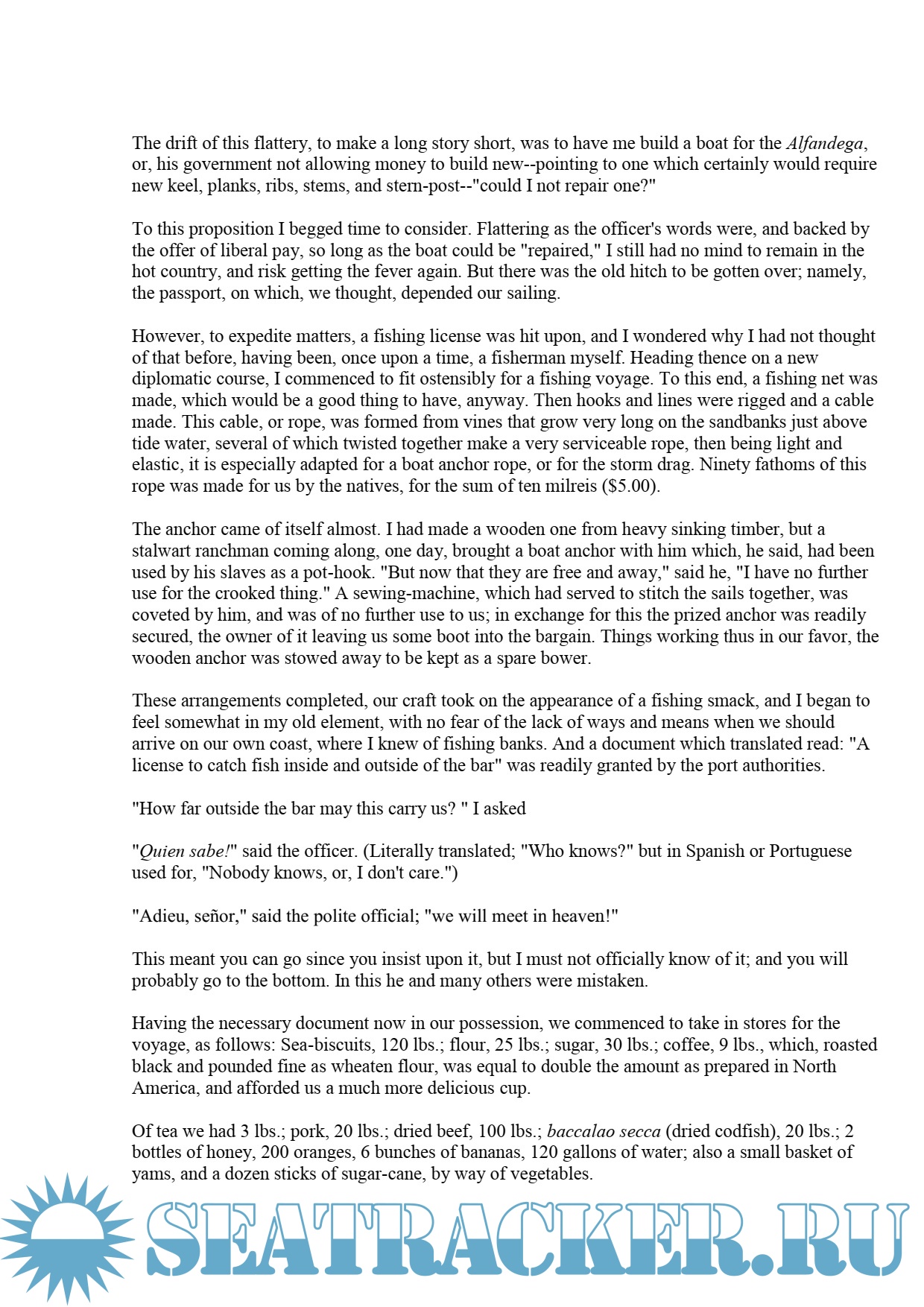 Her crew mustered ten, all told; twelve had been the complement, when freights were good. There were, beside the crew with regular stations, a little lad, aged about six years, and his mamma (age immaterial), privileged above the rest, having "all nights in"--that is, not having to stand watch. The mate, Victor, who is to see many adventures before reaching New York again, was born and bred on shipboard. He was in perfect health, and as strong as a windlass. When he first saw the light and
