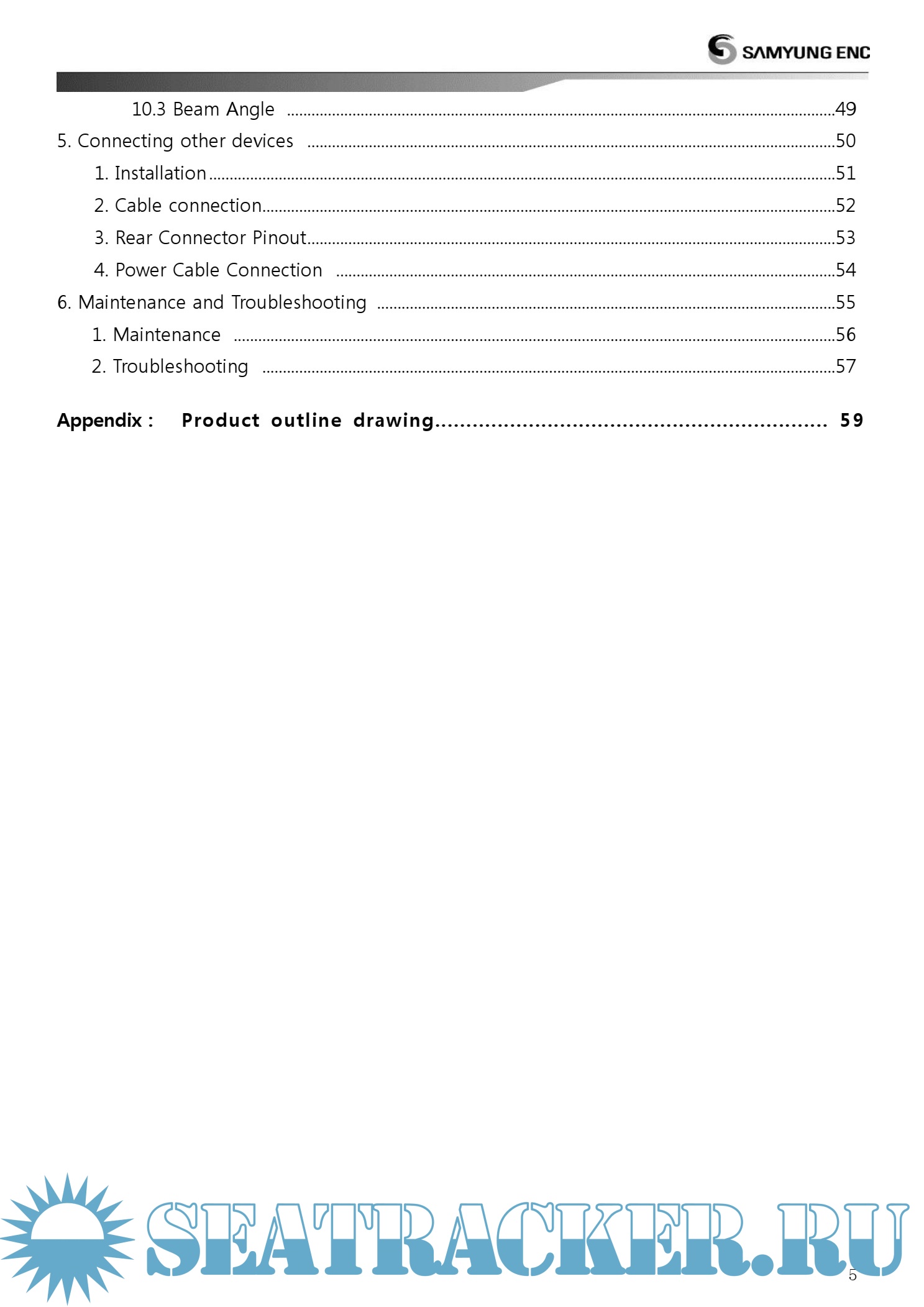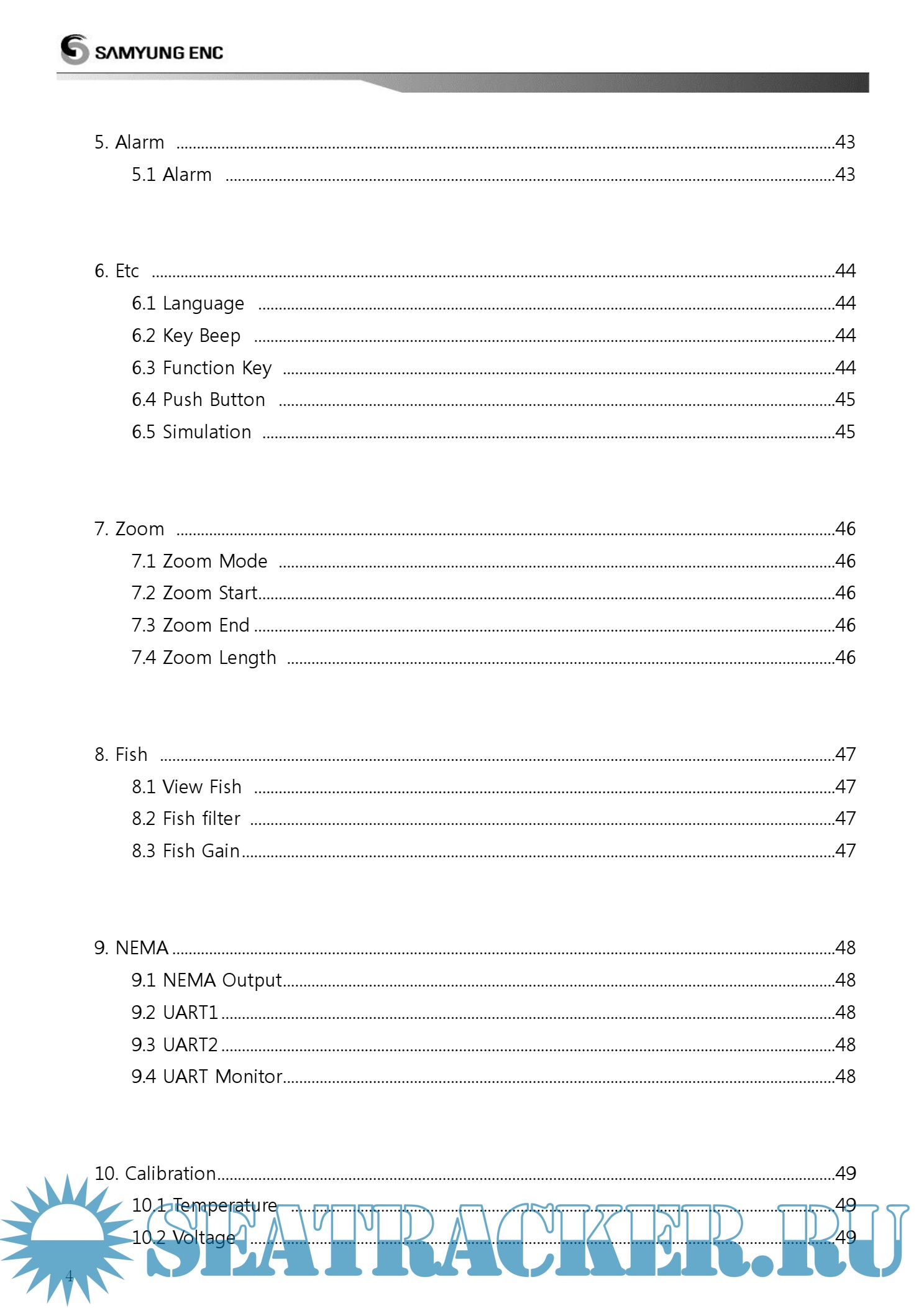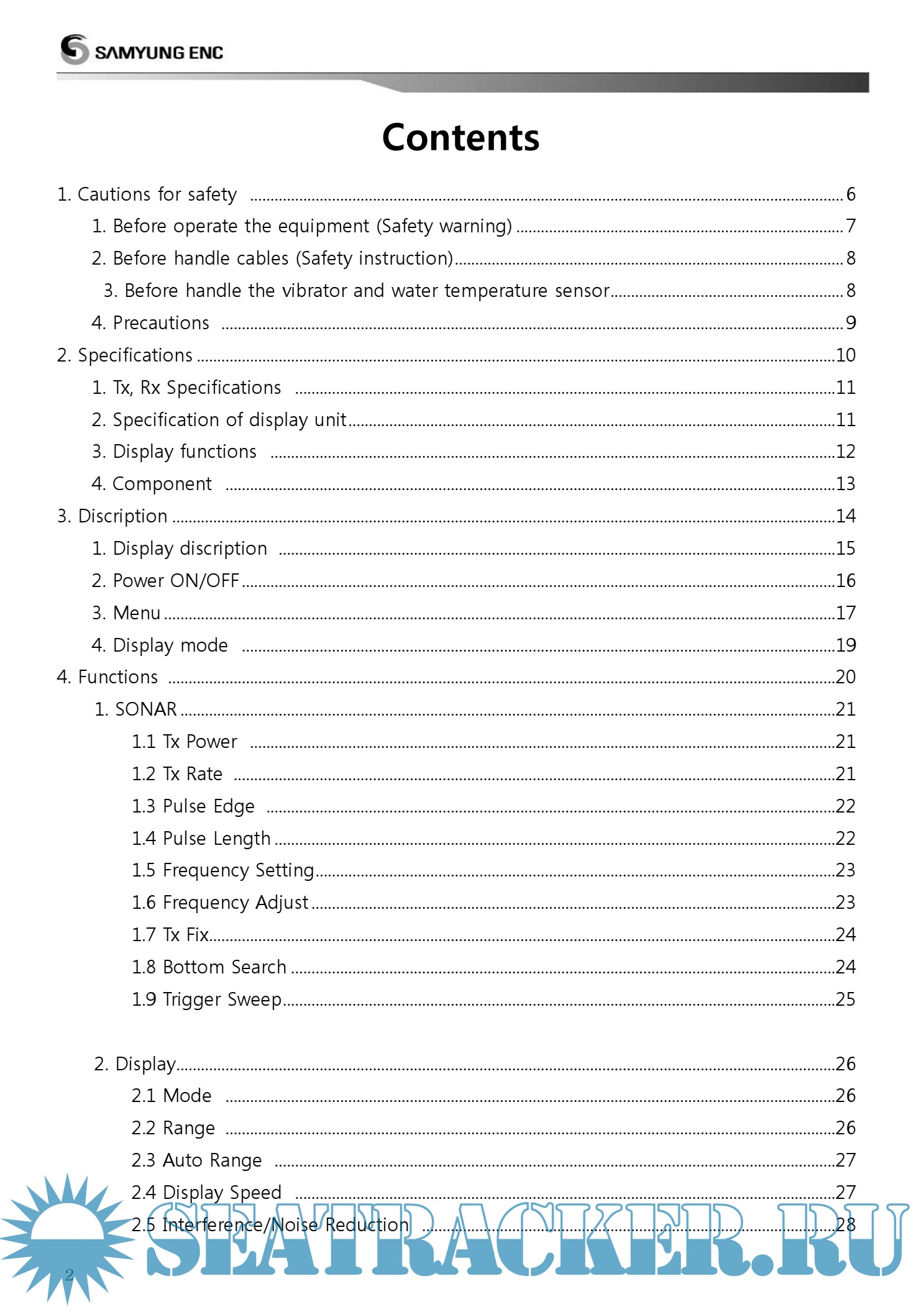Year: 2014 Language: english Author: Samyung ENC Genre: Manual Publisher: Samyung ENC Format: PDF Quality: eBook Pages count: 59 Description: • Easy and quick gain setting control - When gain changes are applied, the previous echoes are applied at the same as the new echoes - Allows to display weakly recorded fish group • Allows to display weakly recorded fish group - 30% increase of transmitting speed allows more detailed fish school to be displayed • Fine tuning of transmitting frequency - Fine tuning over all frequencies including low and high transmitting frequencies • Progressed image processing technology - Express image with various filtering process : Interference removal, noise removal, clutter, color removal and digital filter area setting • Selectable display color - Use may select preferable color display • Display area detected on A-SCOPE - Display area of seabed transmitted by the beam angle from transducer on A-scope to increase ease of work - Beam angle may vary depending on the frequency of the transducer and the installation method. The data displayed on the equipment should be used for reference only • Multi-frequency and the output - The selection of transducers with various frequencies and output is available - 28/38/50/68/82/88/107/150/200 kHz - Dual frequencies - Transmission output can be selected from 1/1.2/1.5/2.5/3KW - Connectable with past transducers • Display white line - White line applied to easily discern seabed from the fish school or reef * Display the strong signal from seabed in the white line in order to easily distinguish between fish group and seabed • Digital filter technology - Digital filter technology applied to display the weakest echoes from small fish and reduce noise at the same time