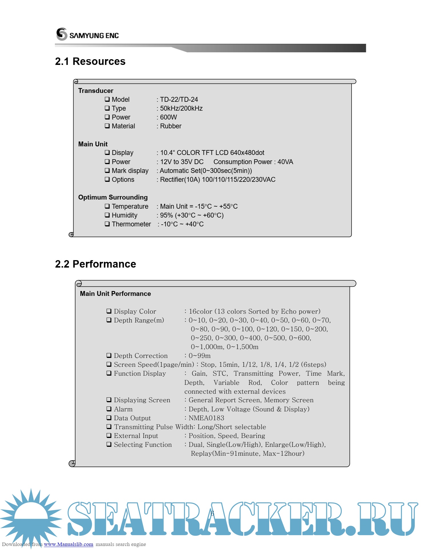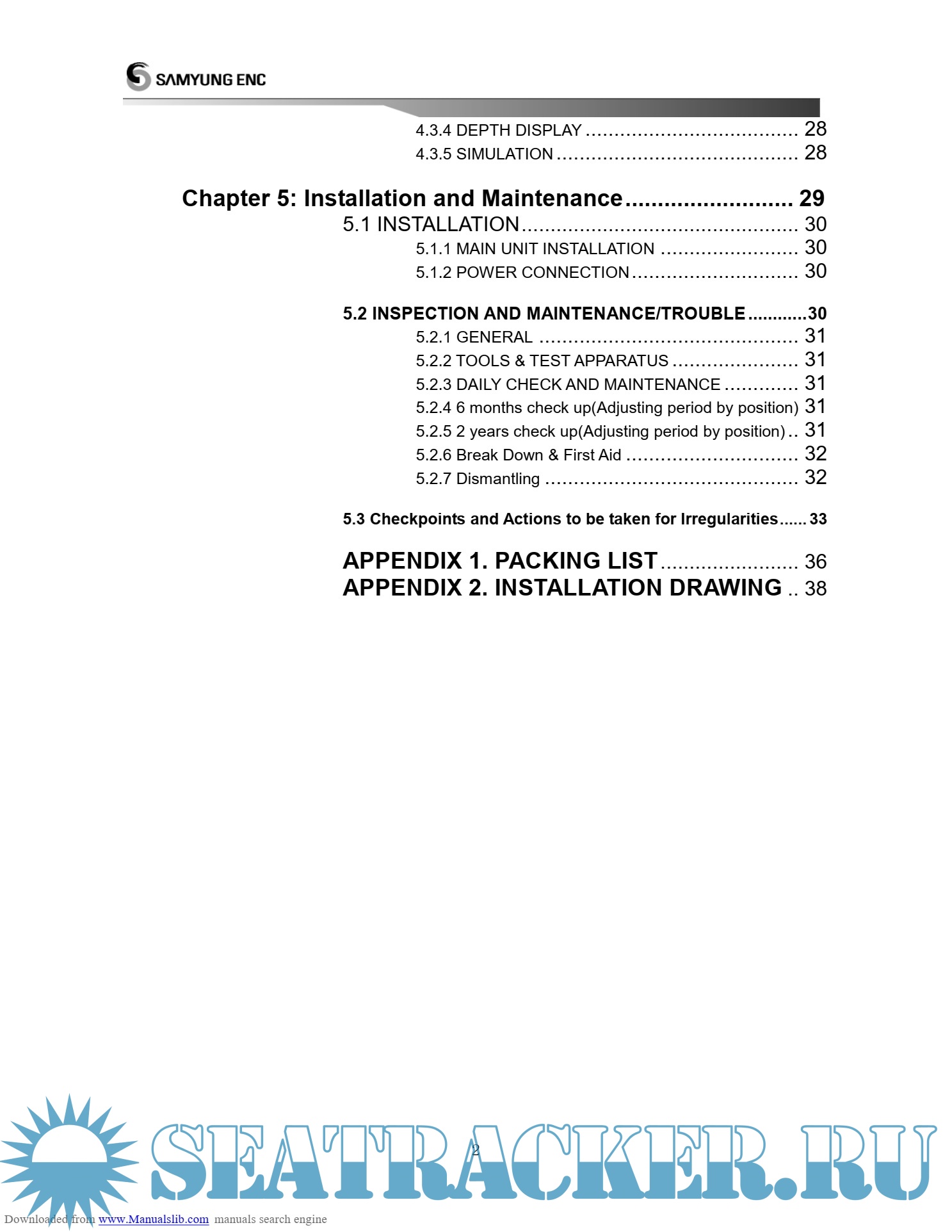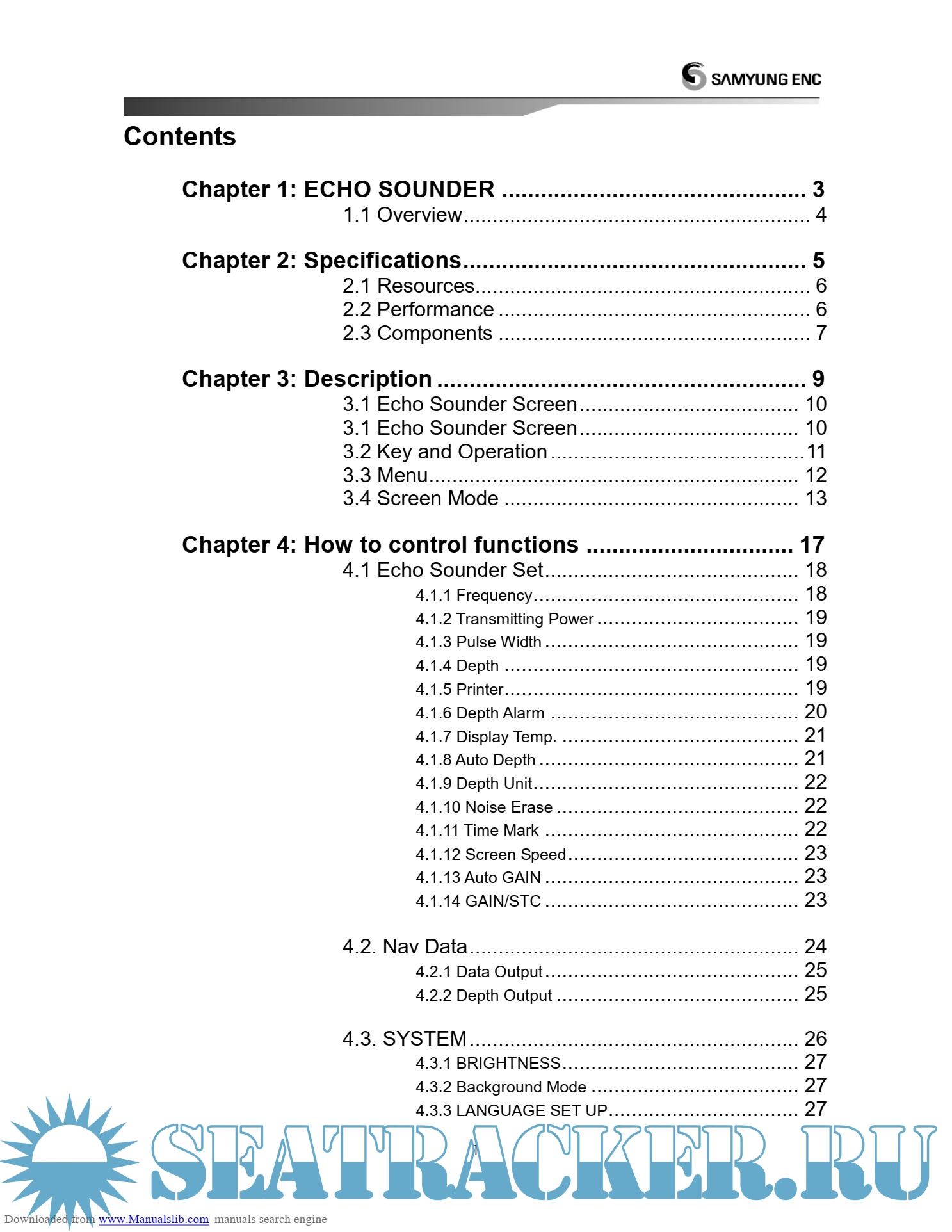 Year: 2016 Language: english Author: Samyung ENC Genre: Manual Publisher: Samyung ENC Format: PDF Quality: eBook Pages count: 38 Description: The Echo sounder an older instrumentation system for indirectly determining ocean floor depth. Echo sounding is based on the principle that water is an excellent medium for the transmission of sound waves and that a sound pulse will bounce off a reflecting layer, returning to its source as an echo. The time interval between the initiation of a sound pulse and echo returned from the bottom can be used to determine the depth of the bottom. An echo-sounding system consists of a transmitter, a receiver that picks up the reflected echo, electronic timing and amplification equipment, and an indicator or graphic recorder. Transducer Model : TD-22/TD-24 Type : 50kHz/200kHz Power : 600W Material : Rubber Main Unit Display : 10.4“ COLOR TFT LCD 640x480dot Power : 12V to 35V DC Consumption Power : 40VA Mark display : Automatic Set(0~300sec(5min)) Options : Rectifier(10A) 100/110/115/220/230VAC Optimum Surrounding Temperature : Main Unit = -15°C ~ +55°C Humidity : 95% (+30°C ~ +60°C) Thermometer : -10°C ~ +40°C