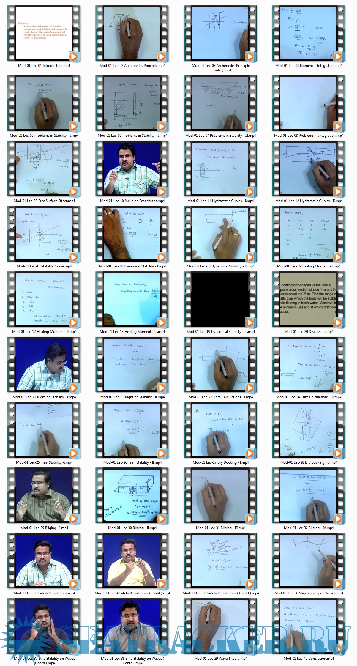 Contents: Hull form definition of ships and ocean structures; Deadweight, capacity and tonnage measurement; Numerical Integration, Hydrostatic calculations; Hydrostatic curves, Initial stability, free surface effects, stability at large angles; Intact and damaged stability computations; IMO stability criteria; Damaged stability and its calculation by lost buoyancy and added weight methods; Subdivision and floodable length calculations; Launching and dry docking calculations; Stability of fully submerged body; Stability of multibody systems; Pressure integration technique of computing hydrostatic and stability.
