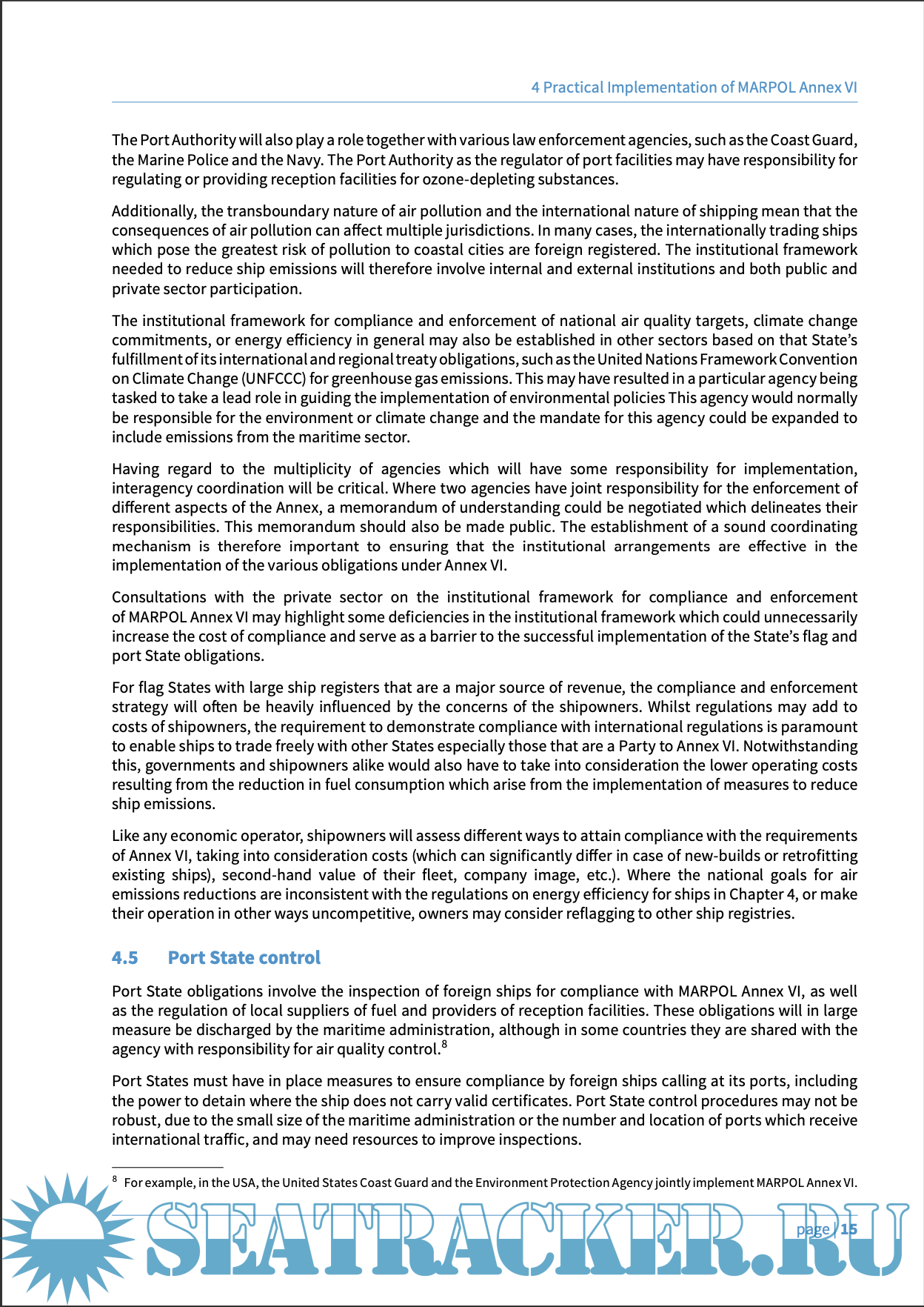 Year: 2018 Language: english Author: University Maritime Advisory Services Genre: Guide Publisher: GloMEEP/IMO Edition: 2018 Format: PDF Quality: eBook Pages count: 52 Description: This guide is a useful tool for States interested in acceding to the 1997 Protocol or for contracting Parties to the 1997 Protocol which have not yet developed the legal framework to implement the regulations in MARPOL Annex VI, and in particular Chapter 4 on energy efficiency for ships, in the domestic legislation. Additional info: The Ship Emissions Toolkit includes three practical guides. While these three individual guides are separate documents and can be used independently, they are complementary and in large parts based on each other.