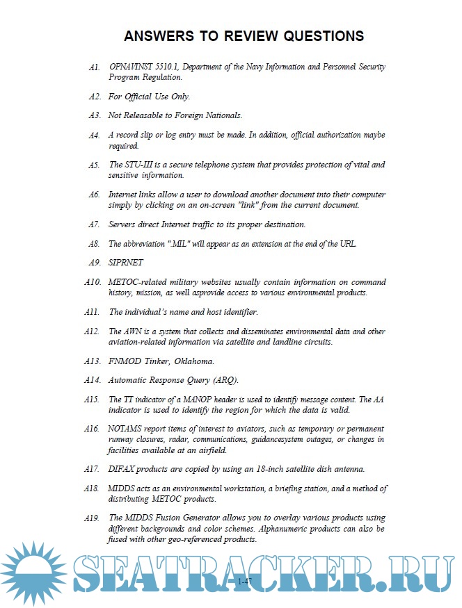 Description: Aerographer’s Mates are enlisted sailors who monitor sea conditions, analyze meteorological data, and develop accurate forecasts. Their responsibilities include: being the Navy’s meteorological and oceanographic experts, distributing weather data, collecting, recording and analyzing weather and oceanographic information, making visual and instrument observations of weather and sea conditions, interpreting satellite data, radar imagery, and meteorological and oceanographic codes. This US Navy self-study course is organized into subject matter areas, each containing learning objectives along with text and illustrations, in order to help understanding. The subject matter reflects day-to-day requirements and experiences of personnel in the rating or skill area.