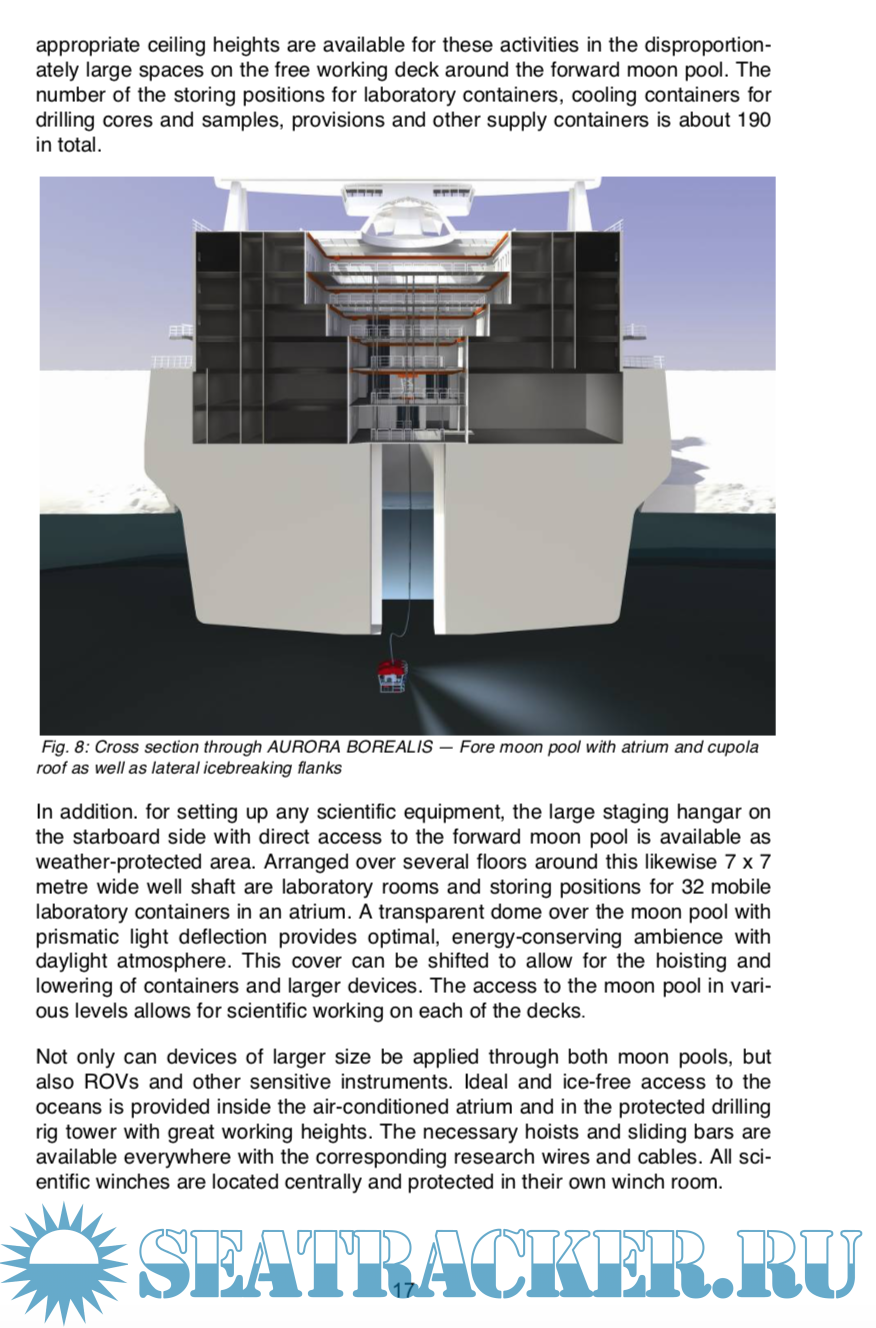 The ship shall have the unique capability to perform scientific deep-sea drilling operations in water depths between 100 and 5000 metres with a penetration of more than 1000 metres into the seafloor, even while being located amid drifting pack-ice fields. To perform these drilling operations AURORA BOREALIS has to be kept exactly on position. A dynamic positioning system capable for ma- noeuvring and staying on position in drifting sea-ice is mandatory for this task – an absolute novelty in the shipping industry. Another unique characteristic of AURORA BOREALIS are the two moon pools (7 x 7 meters each) in the midst of the hull that reach into the water below the vessel and enable scientists to deploy equipment into the ocean without being subject to wind, waves and ice. The aft moon pool is mainly dedicated to drilling operations, while the forward moon pool is reserved for most other scientific equipment. This allows as a first the deployment of very sensitive and expensive equipment, e.g. remotely oper- ated (ROVʼs) or autonomous (AUVʼs) underwater vehicles within completely closed sea ice cover. Scientific laboratories are located on several decks around the moon pool, which is designed in an atrium-like shape with circular walkways and preparation areas. In order to optimally equip the ship even for mission specific expeditions, containerized laboratories can be also loaded here and become fully integrated into the scientific workflow on board.