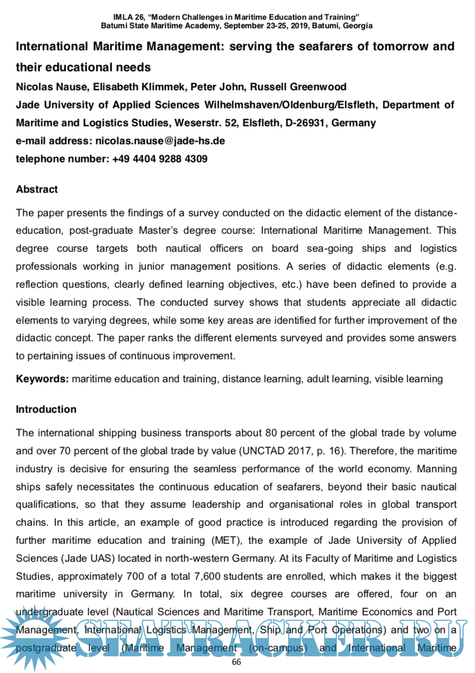 Contributions to the IMLA 26 deal with the challenges related with development and implementation of distance learning in MET, LLL (lifelong learning) & CE (continuous education), simulator training based learning in MET, Problems of attractiveness of Maritime Education and Profession, collaboration between “Academia” and “Industry” for development of relevant skills, curricula internationalization and harmonization, IT technologies in MET, development of new technologies in Maritime Industry and its implementation in educational process, maritime training and certification challenges and other contemporary MET issues.
