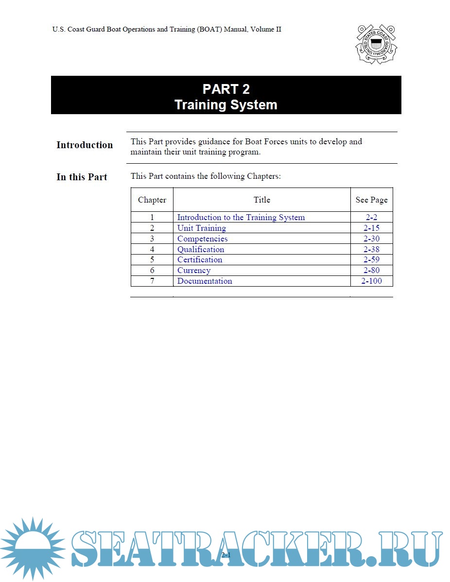 Volume 2 states policies and requirements about competencies, qualification and certifications, boat forces readiness program, unit assesment and drills. See contents for detailed informations.
